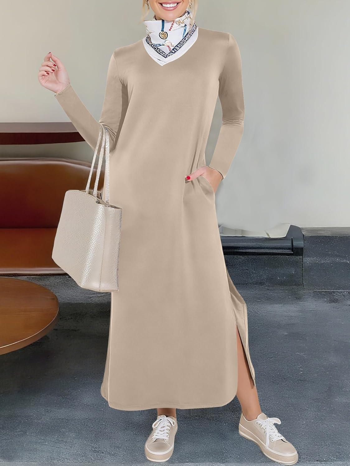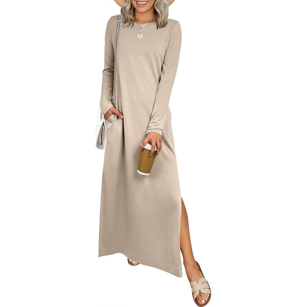 ANRABESS Women Long Sleeve Dresses 2025 Fall Casual Crewneck Loose Fit Split Flowy Wrinkle-Free Travel Vacation Maxi Dress(Khaki)