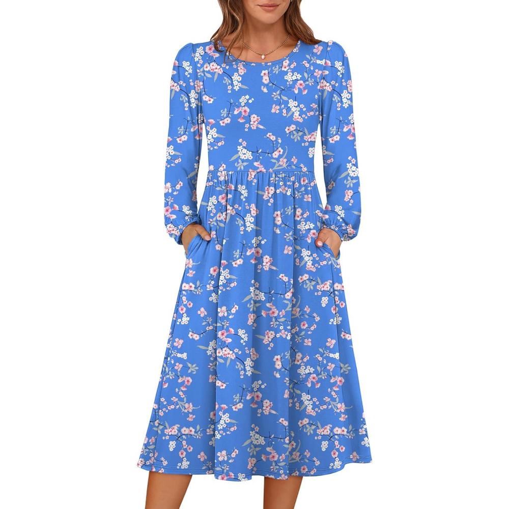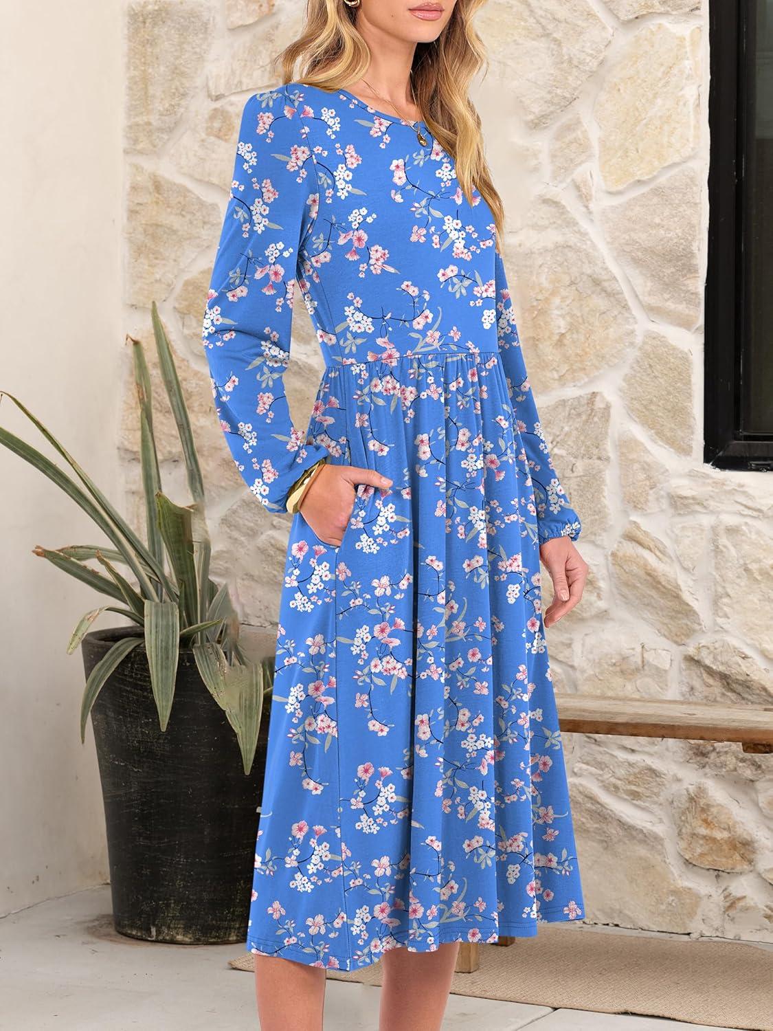 ANRABESS Women Long Sleeve Midi Dress Crewneck 2025 Fall Fashion Casual Flowy A-Line Long Dresses Vacation Outfit with Pocket(Blue Pink Flower)