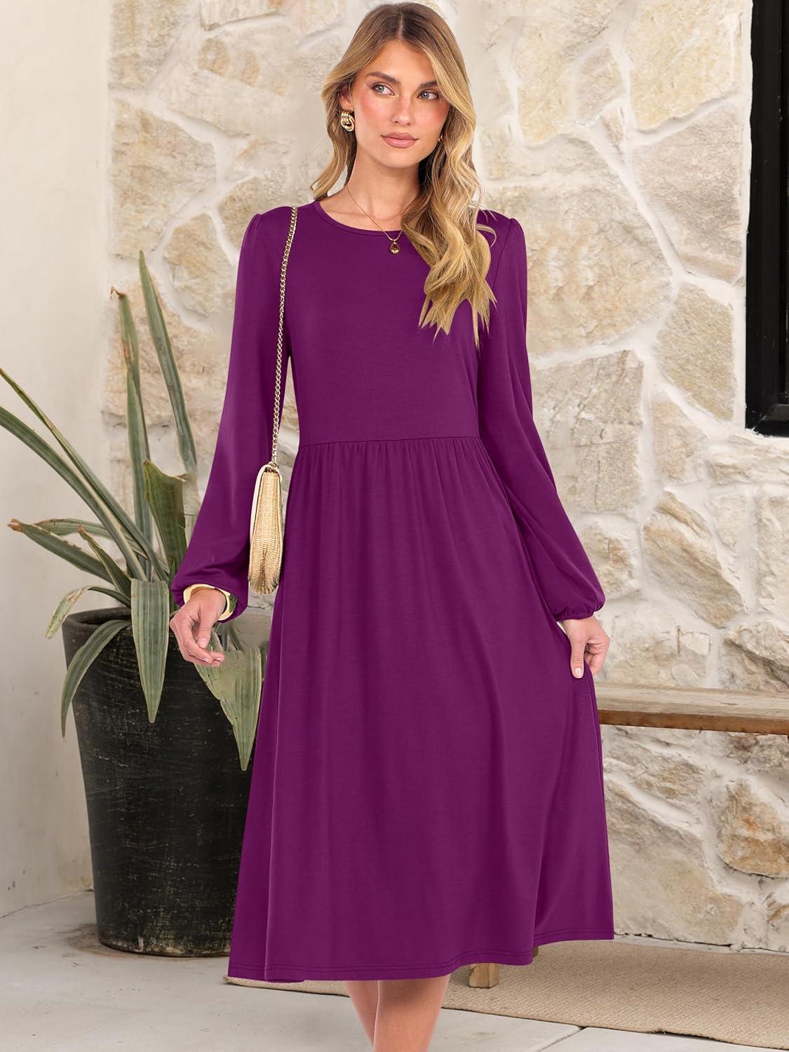 ANRABESS Women Long Sleeve Midi Dress Crewneck 2025 Fall Fashion Casual Flowy A-Line Long Dresses Vacation Outfit with Pocket(Deep Purple)