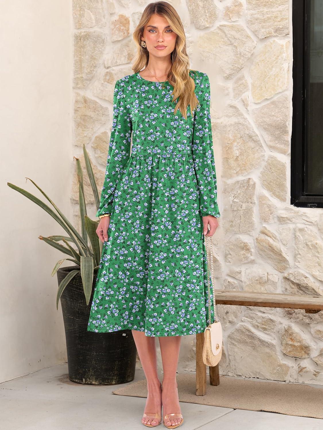 imageANRABESS Women Long Sleeve Midi Dress Crewneck 2025 Fall Fashion Casual Flowy ALine Long Dresses Vacation Outfit with PocketFloral Green