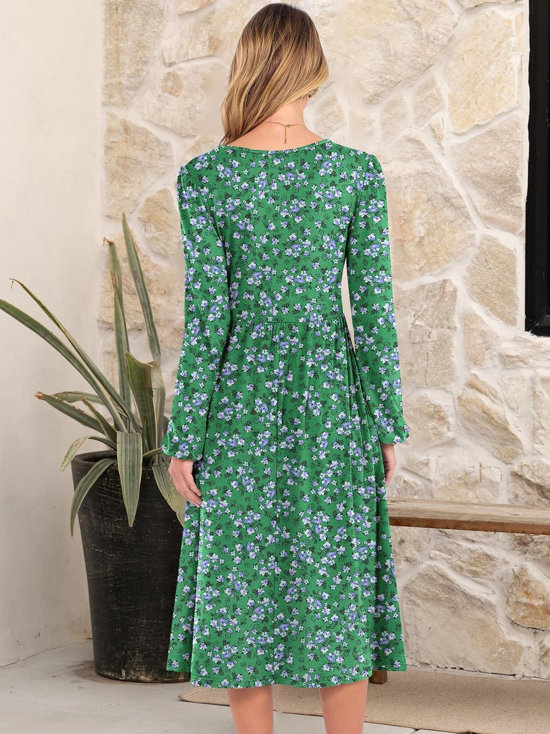ANRABESS Women Long Sleeve Midi Dress Crewneck 2025 Fall Fashion Casual Flowy A-Line Long Dresses Vacation Outfit with Pocket(Floral Green)