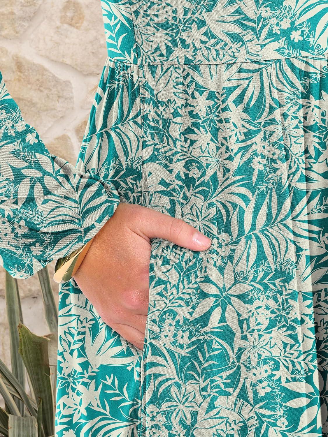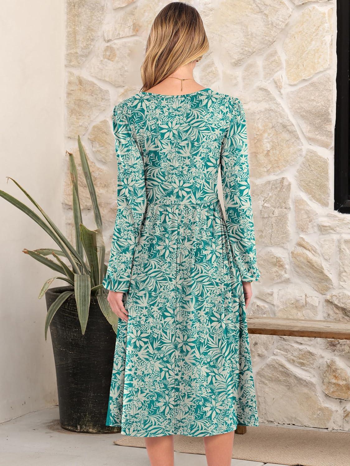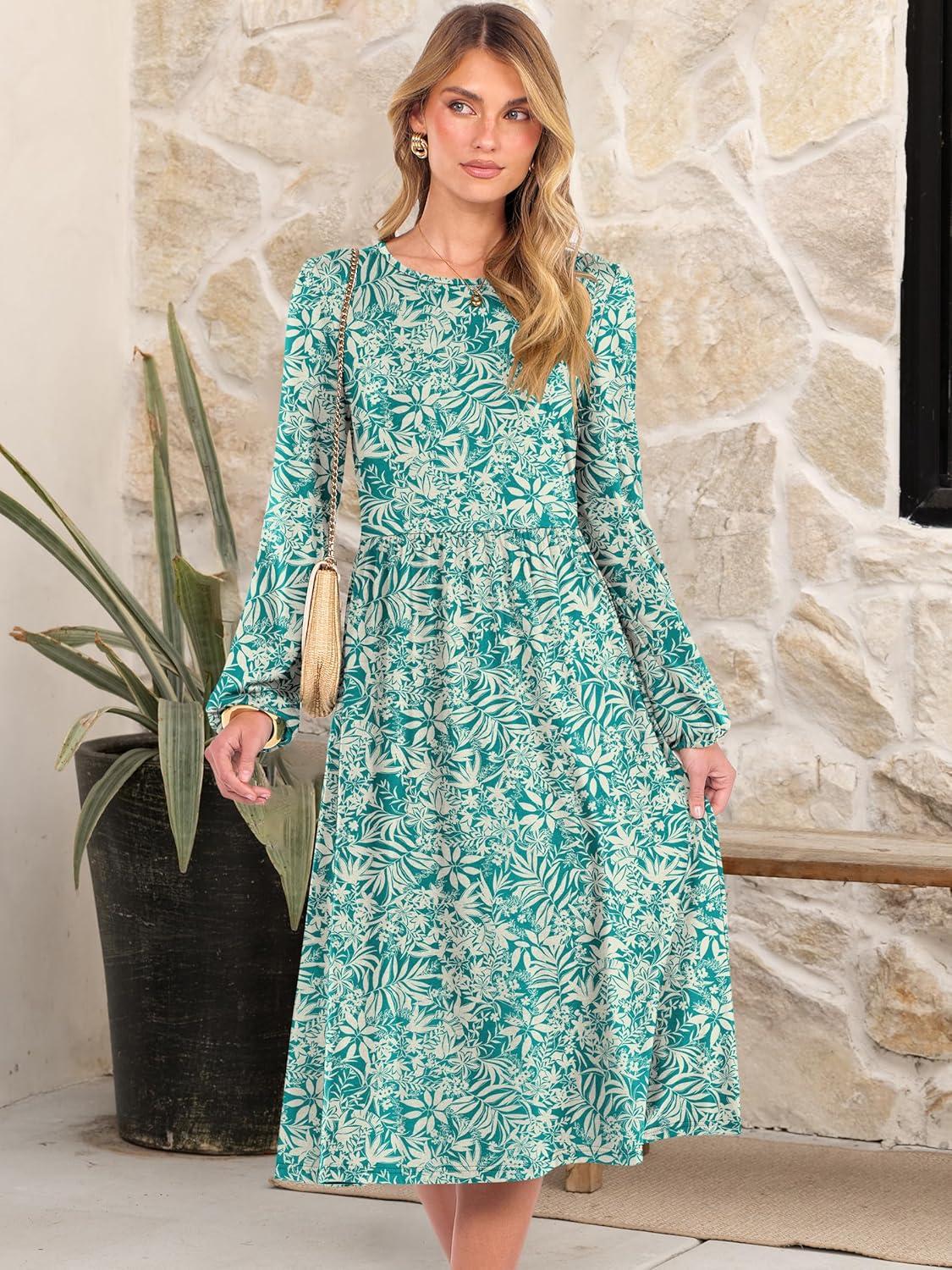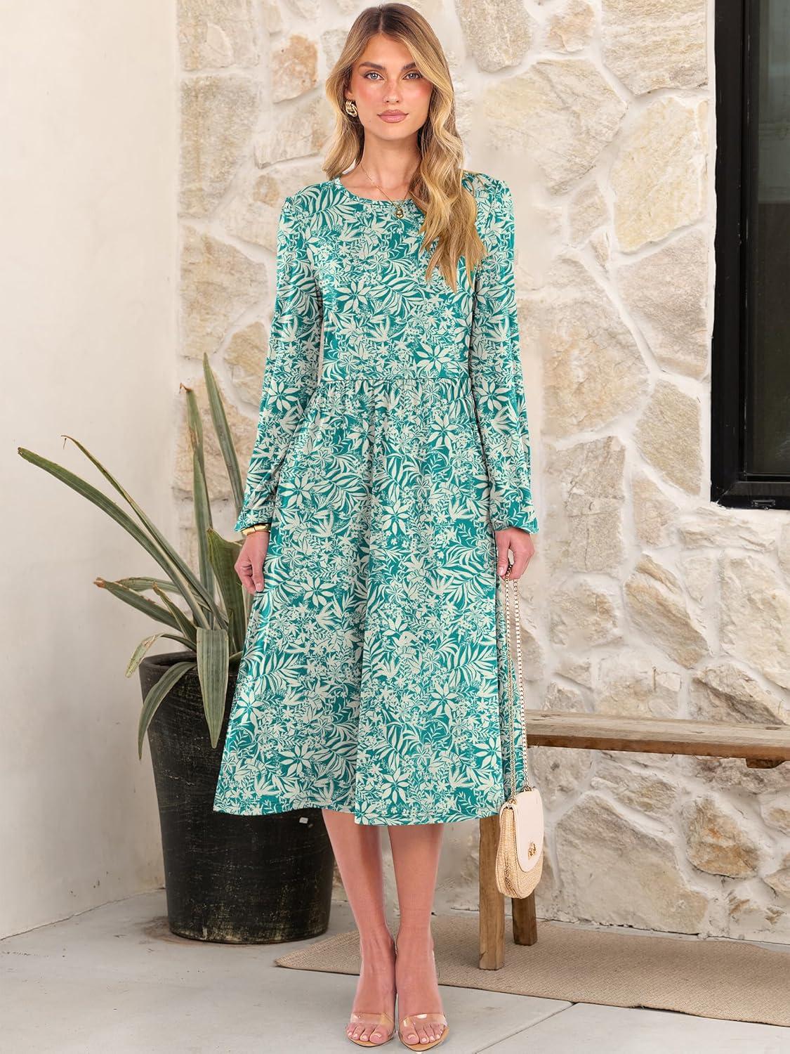 ANRABESS Women Long Sleeve Midi Dress Crewneck 2025 Fall Fashion Casual Flowy A-Line Long Dresses Vacation Outfit with Pocket(Floral Green)