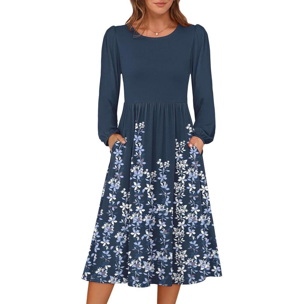 ANRABESS Women Long Sleeve Midi Dress Crewneck 2025 Fall Fashion Casual Flowy A-Line Long Dresses Vacation Outfit with Pocket(Navy Blue Floral Hem)