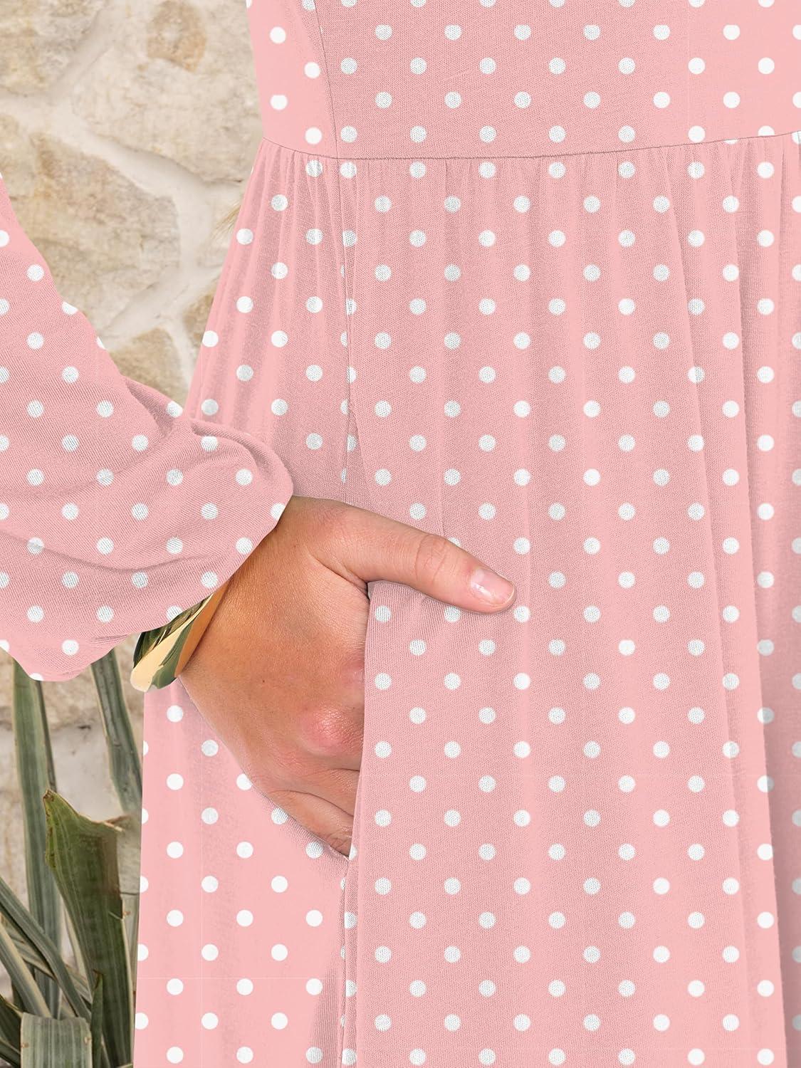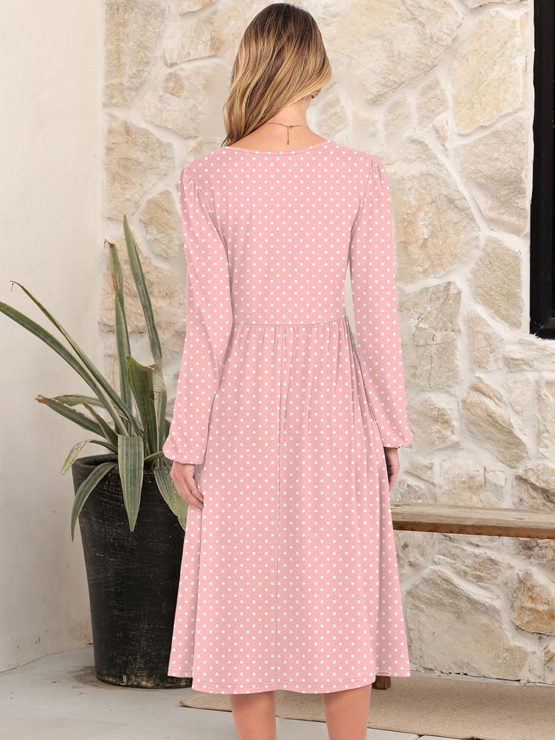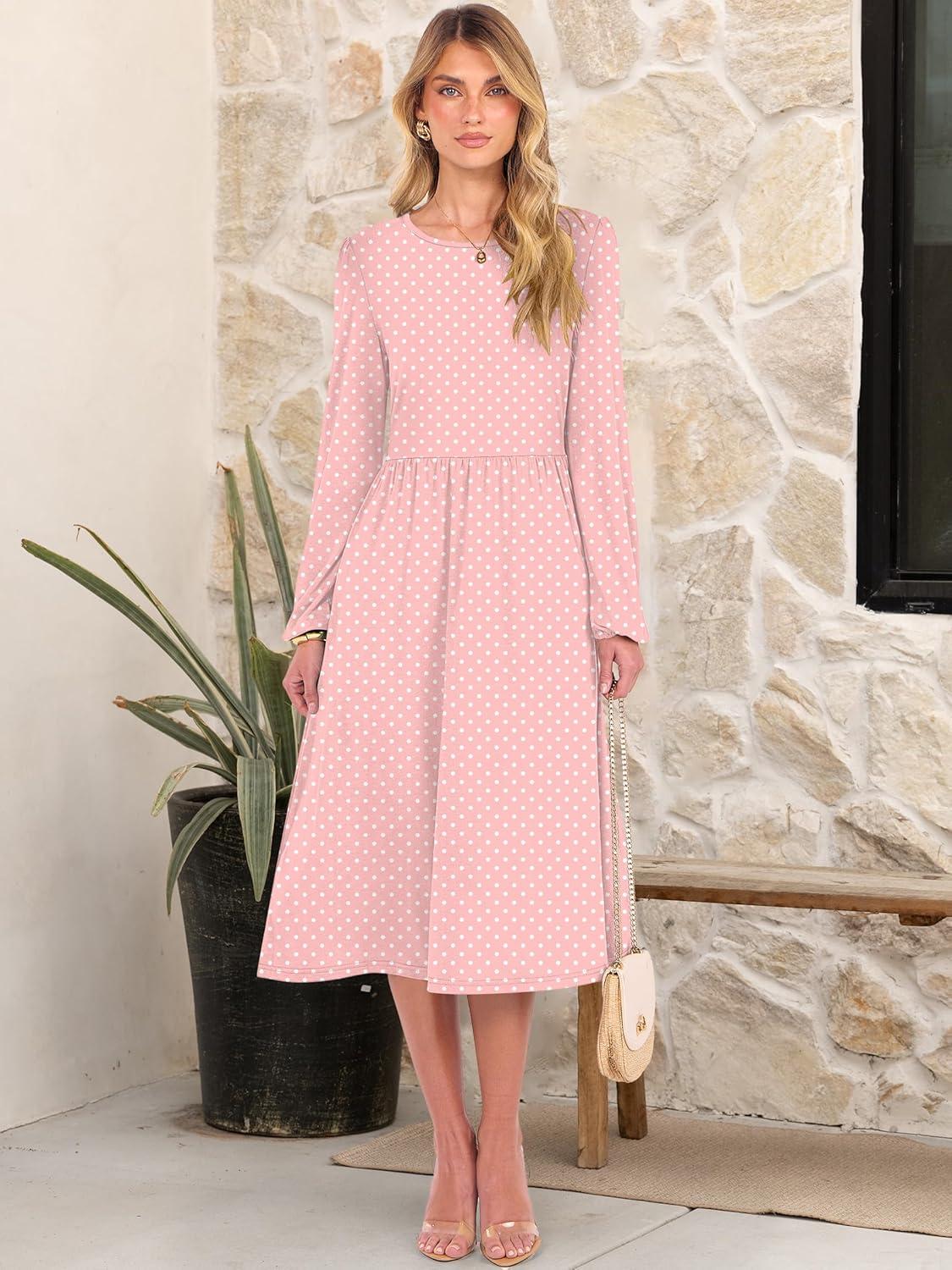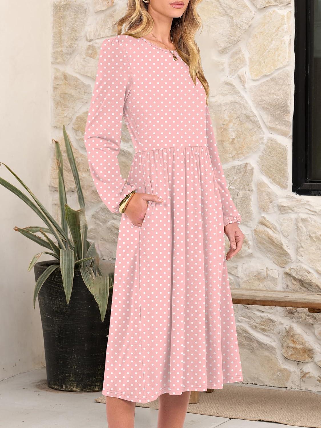 ANRABESS Women Long Sleeve Midi Dress Crewneck 2025 Fall Fashion Casual Flowy A-Line Long Dresses Vacation Outfit with Pocket(Pink Round Dot)