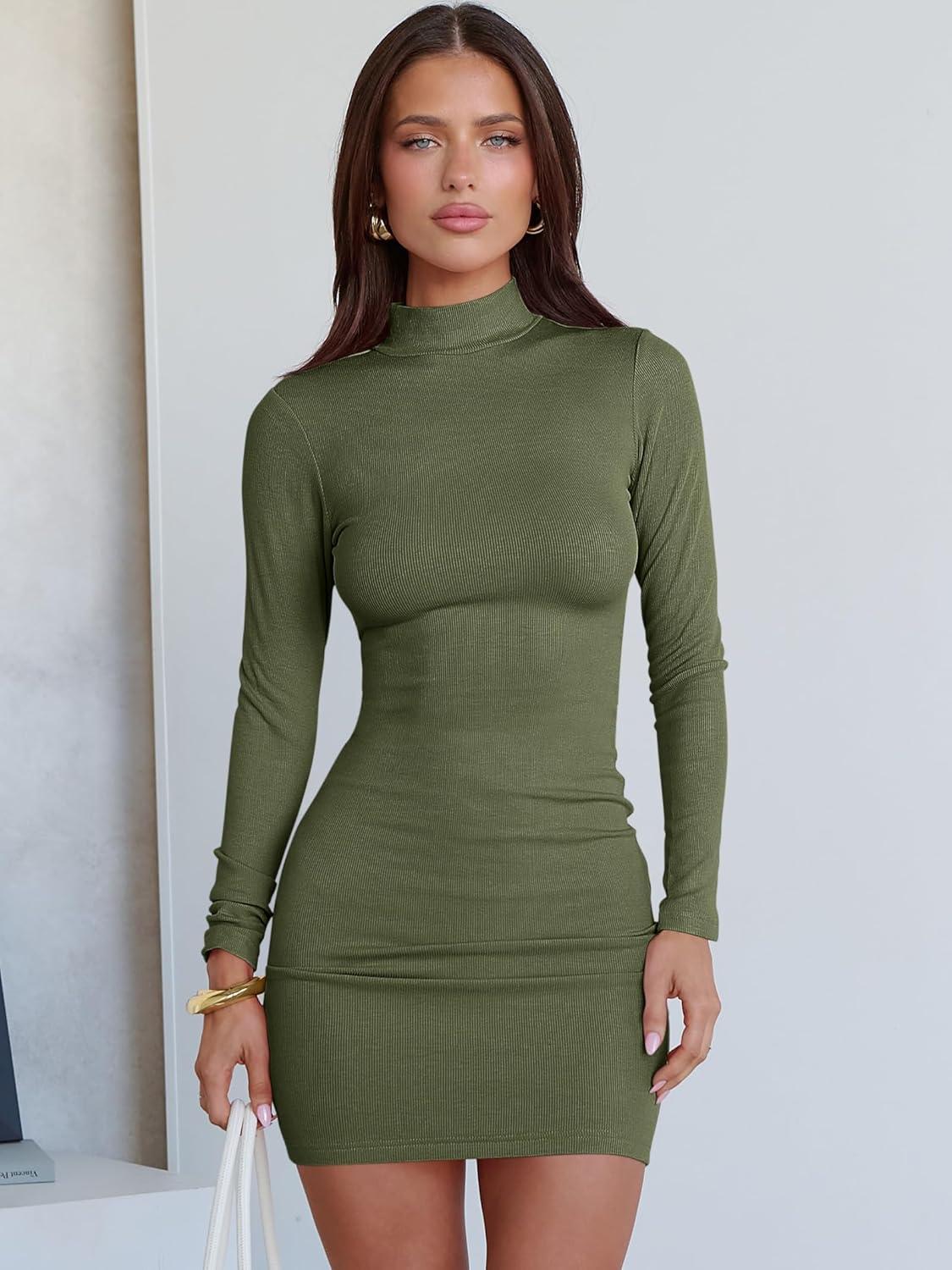 ANRABESS Women Long Sleeve Mock Neck Bodycon Mini Dress 2025 Fall Ribbed Slim Fit Pencil Cocktail Club Night Dresses(Army Green)