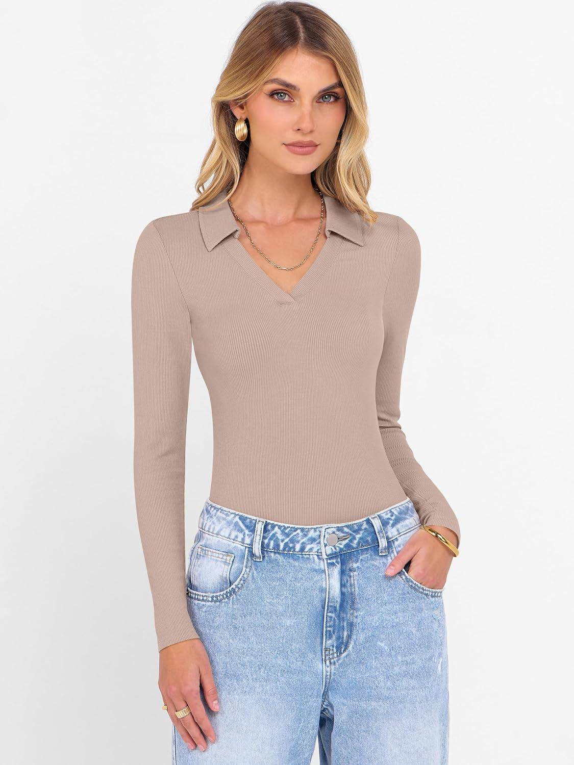 imageANRABESS Women Long Sleeve Polo Shirts V Neck Slim Rib Knit Collared Dressy Business Casual Top 2025 Basic Tee Fall OutfitsLight Camel