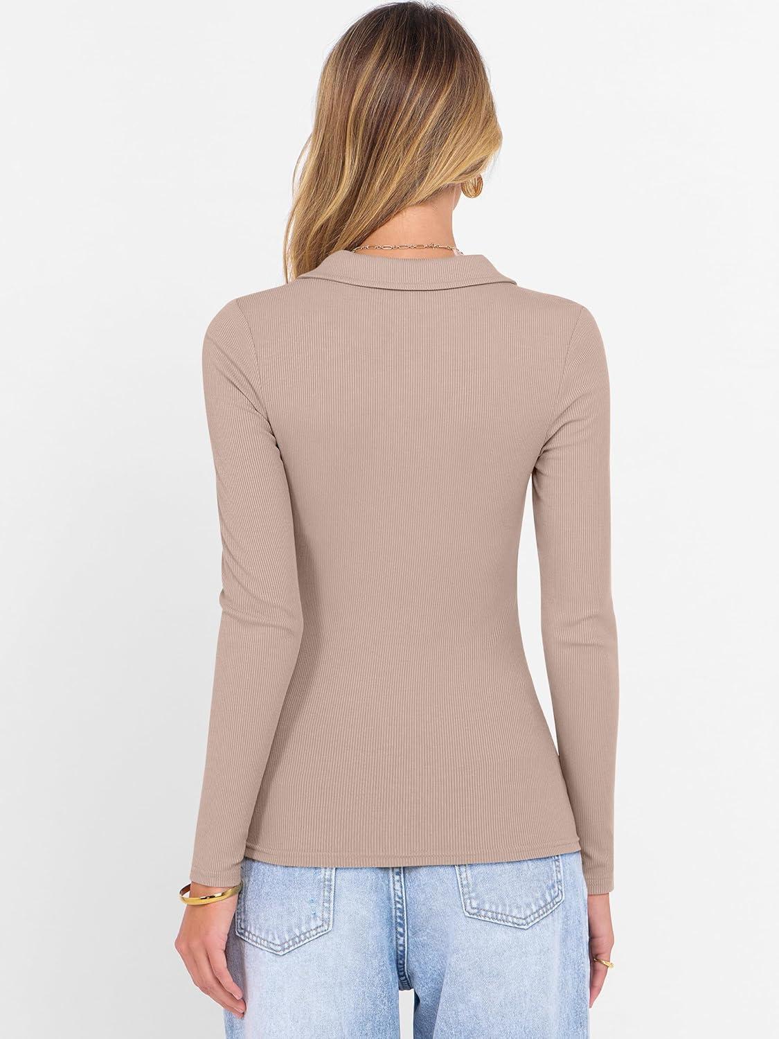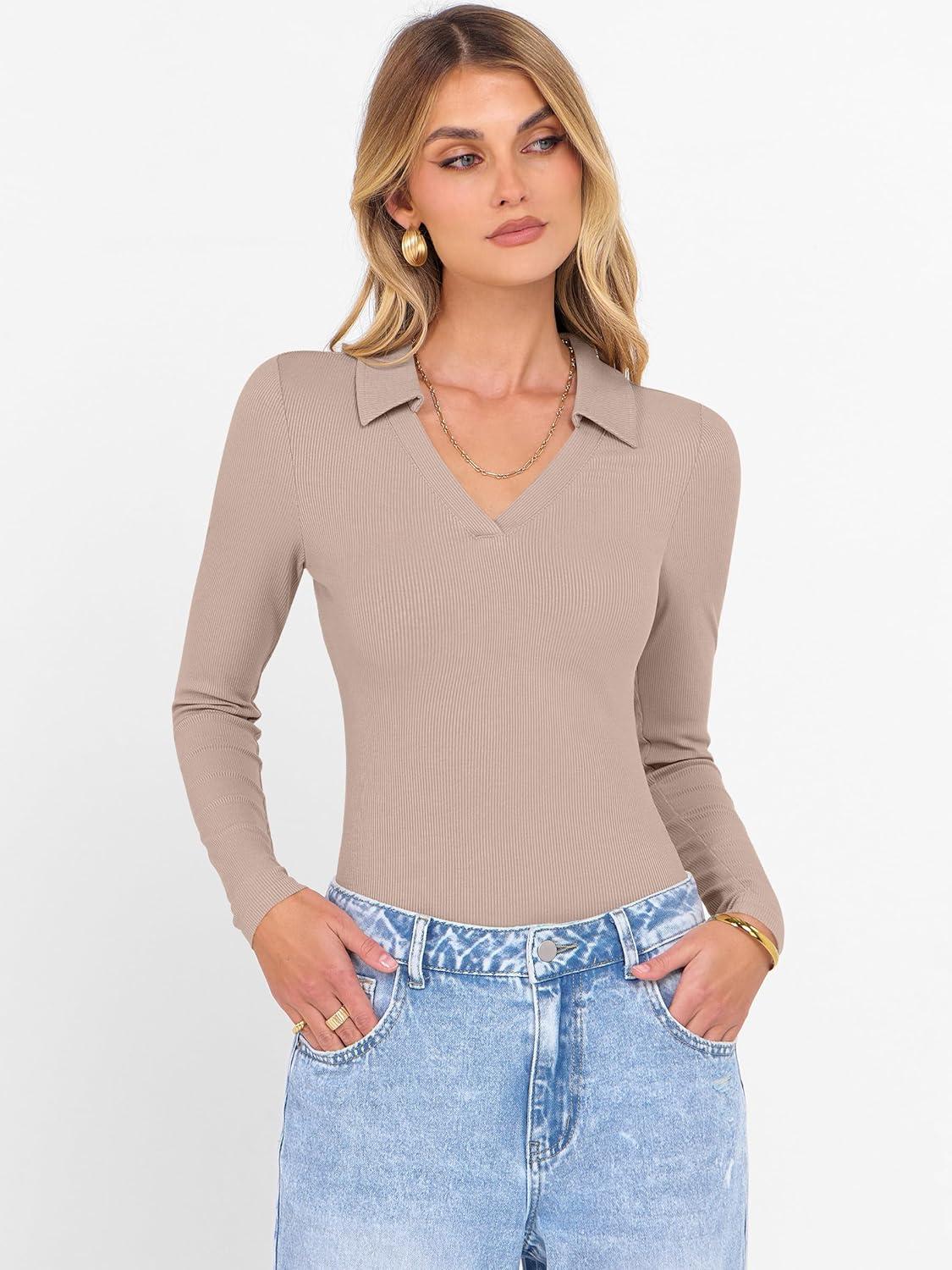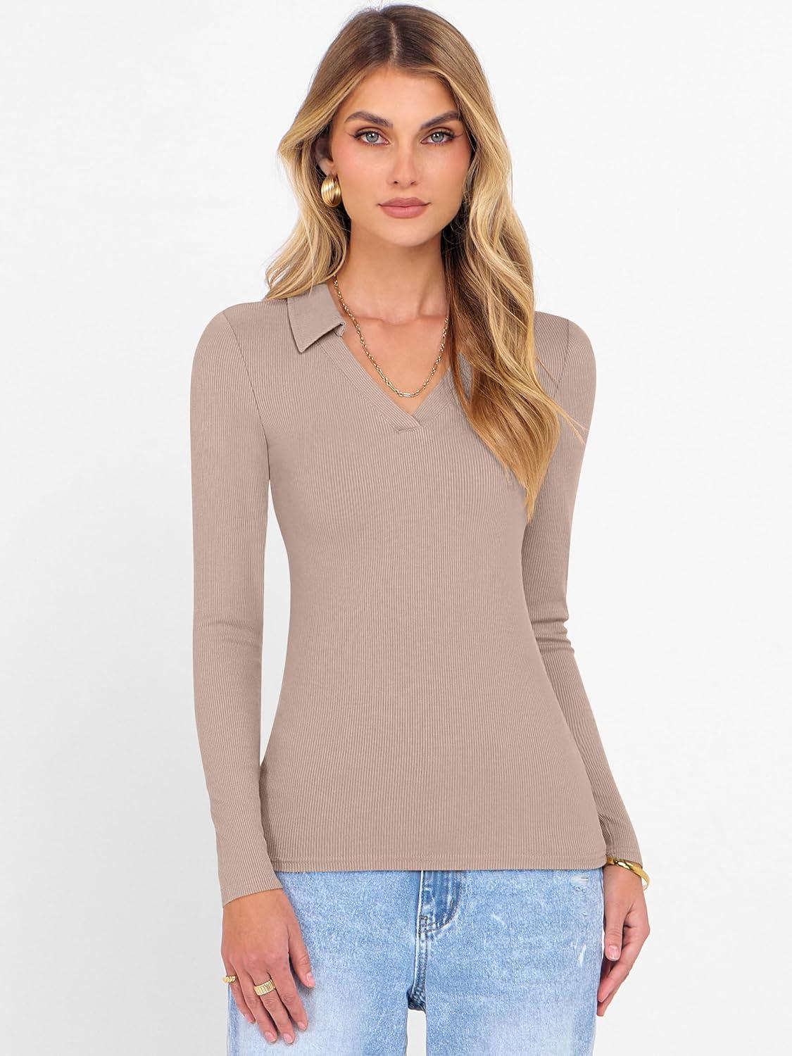 ANRABESS Women Long Sleeve Polo Shirts V Neck Slim Rib Knit Collared Dressy Business Casual Top 2025 Basic Tee Fall Outfits(Light Camel)