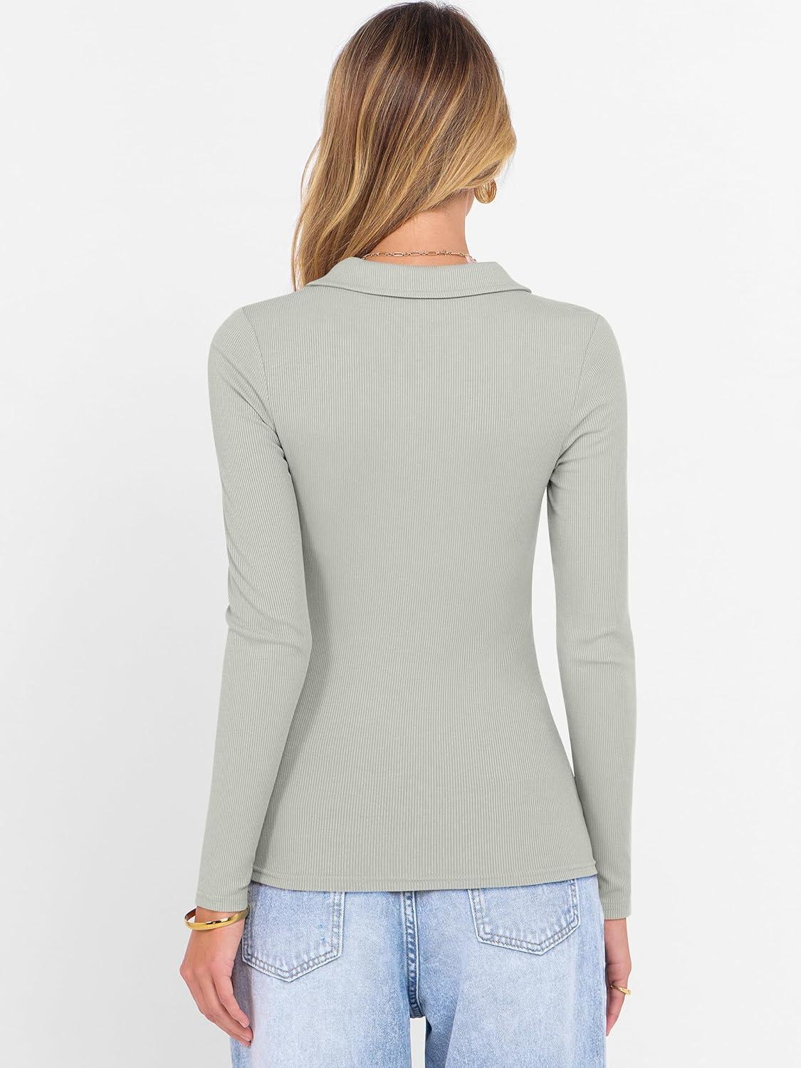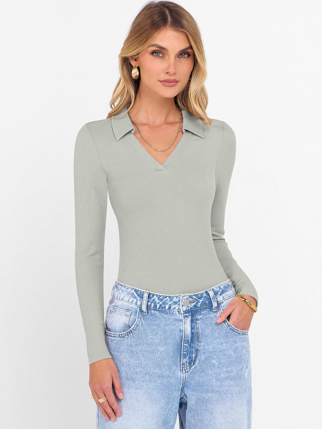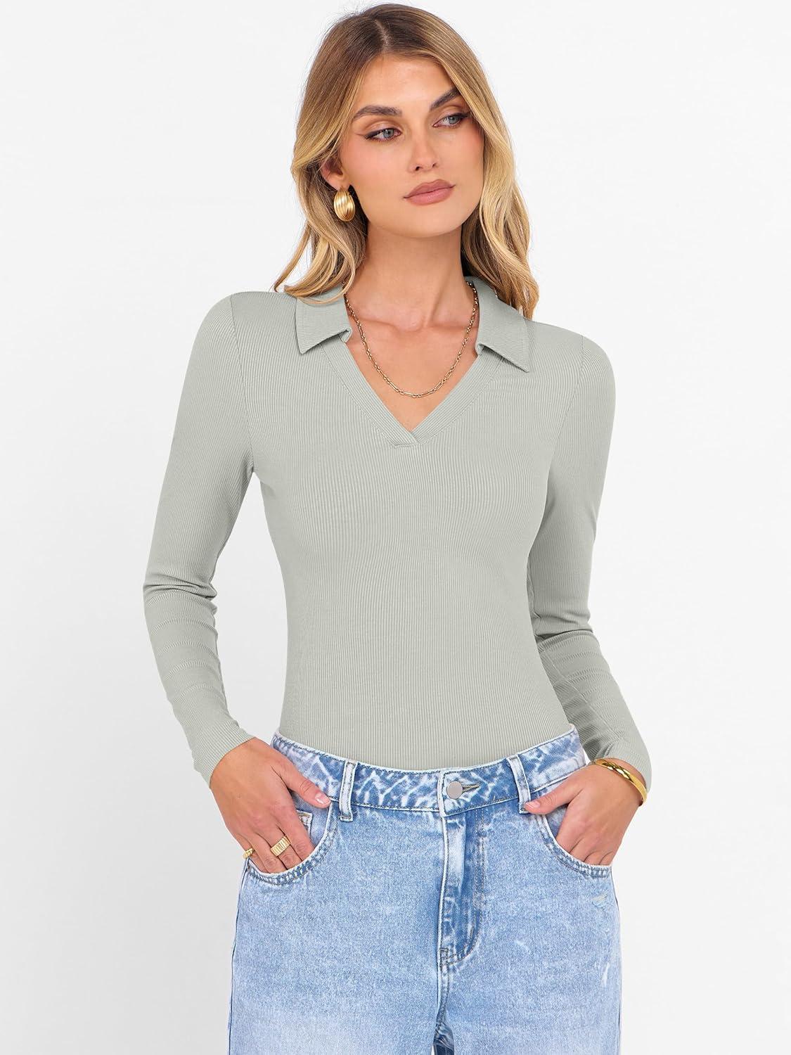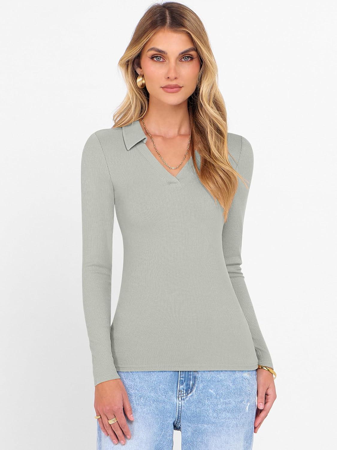imageANRABESS Women Long Sleeve Polo Shirts V Neck Slim Rib Knit Collared Dressy Business Casual Top 2025 Basic Tee Fall OutfitsLight Green