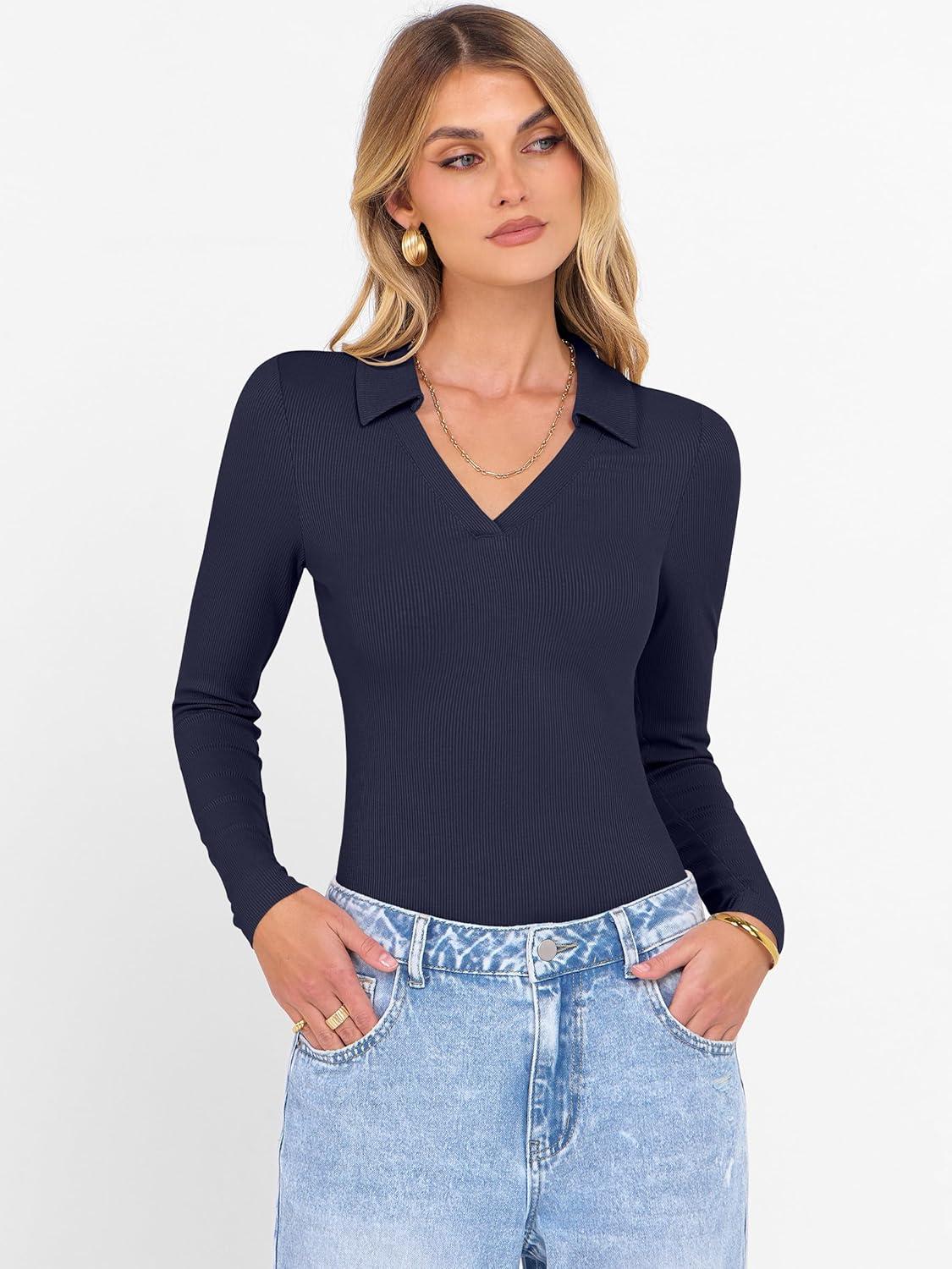 imageANRABESS Women Long Sleeve Polo Shirts V Neck Slim Rib Knit Collared Dressy Business Casual Top 2025 Basic Tee Fall OutfitsNavy Blue