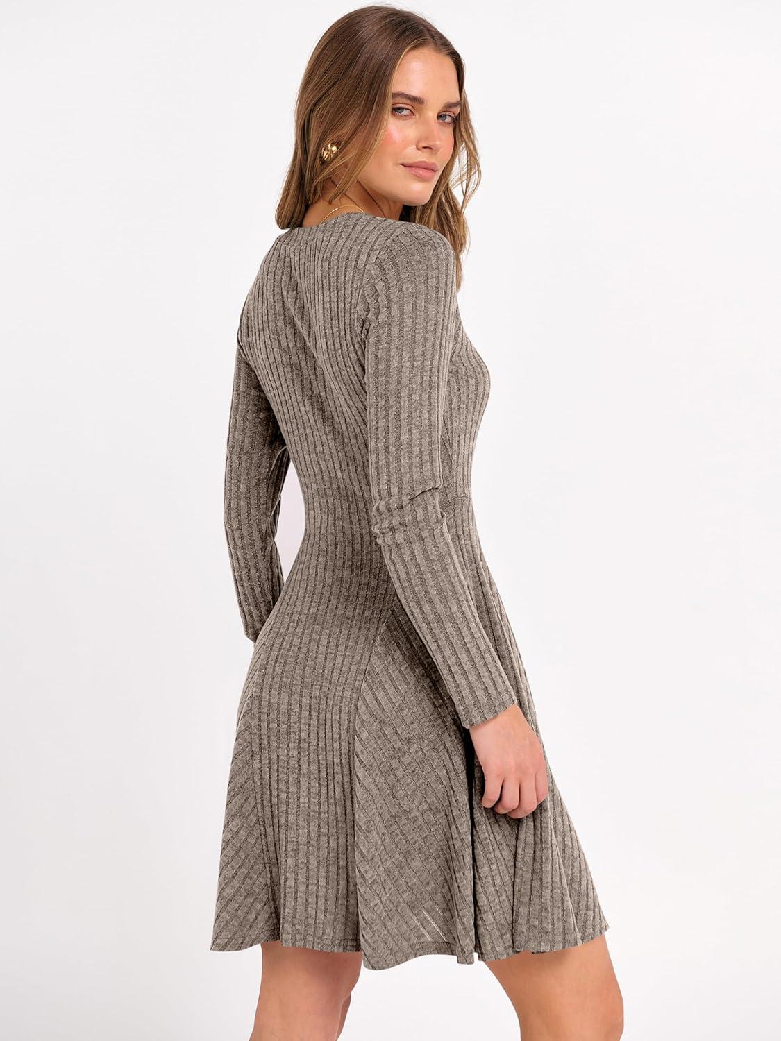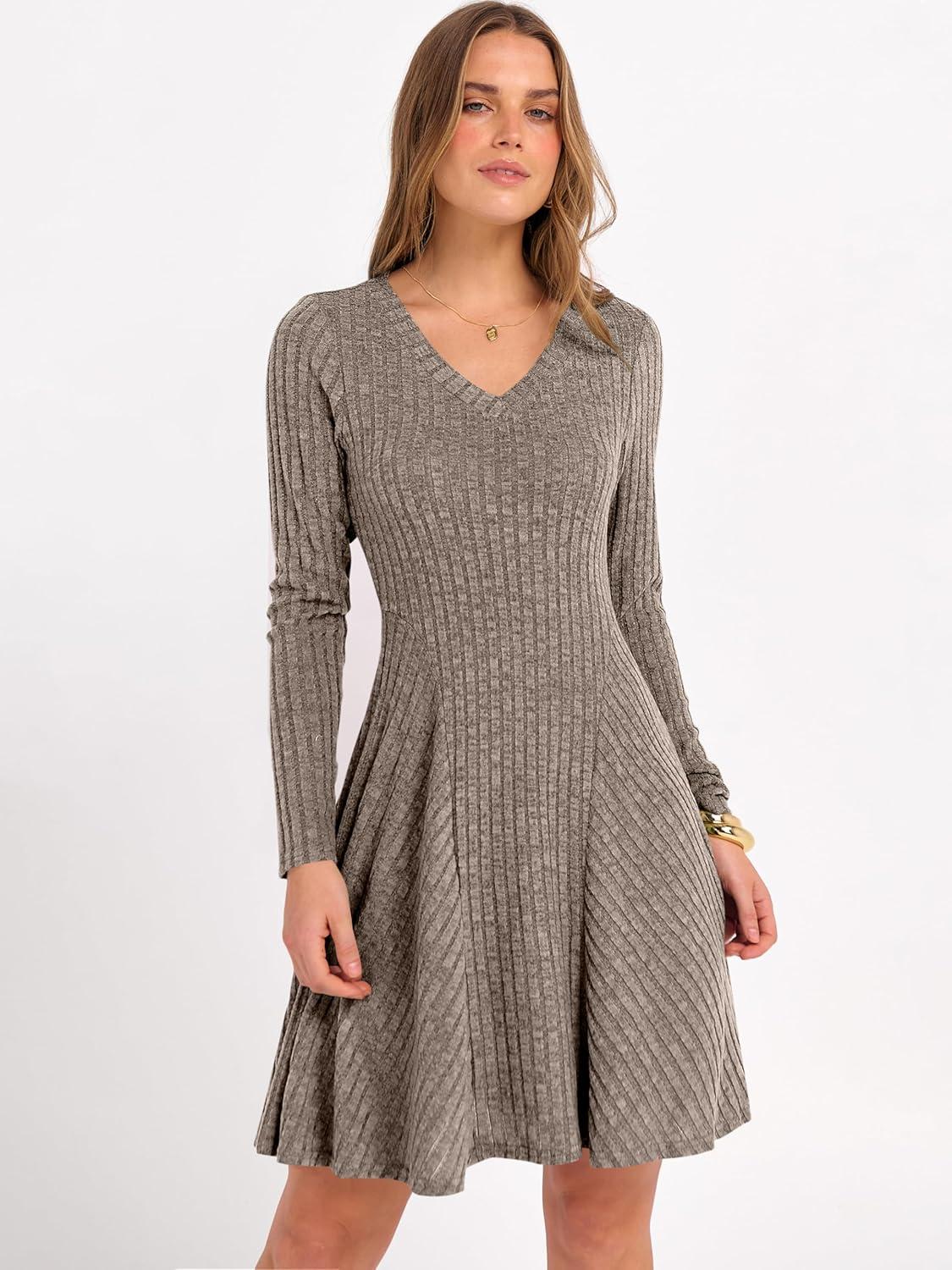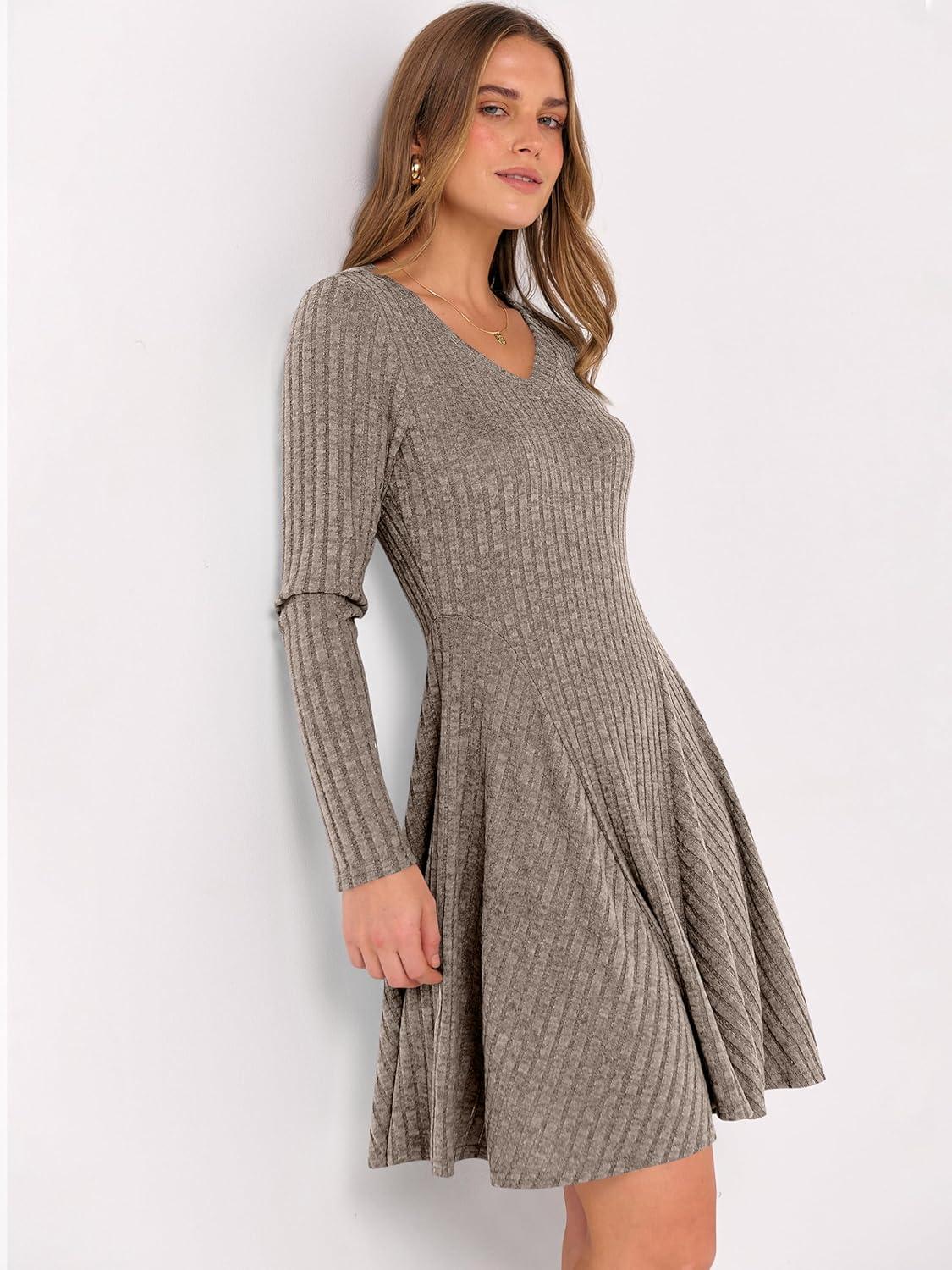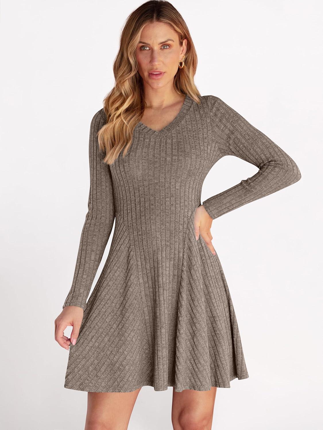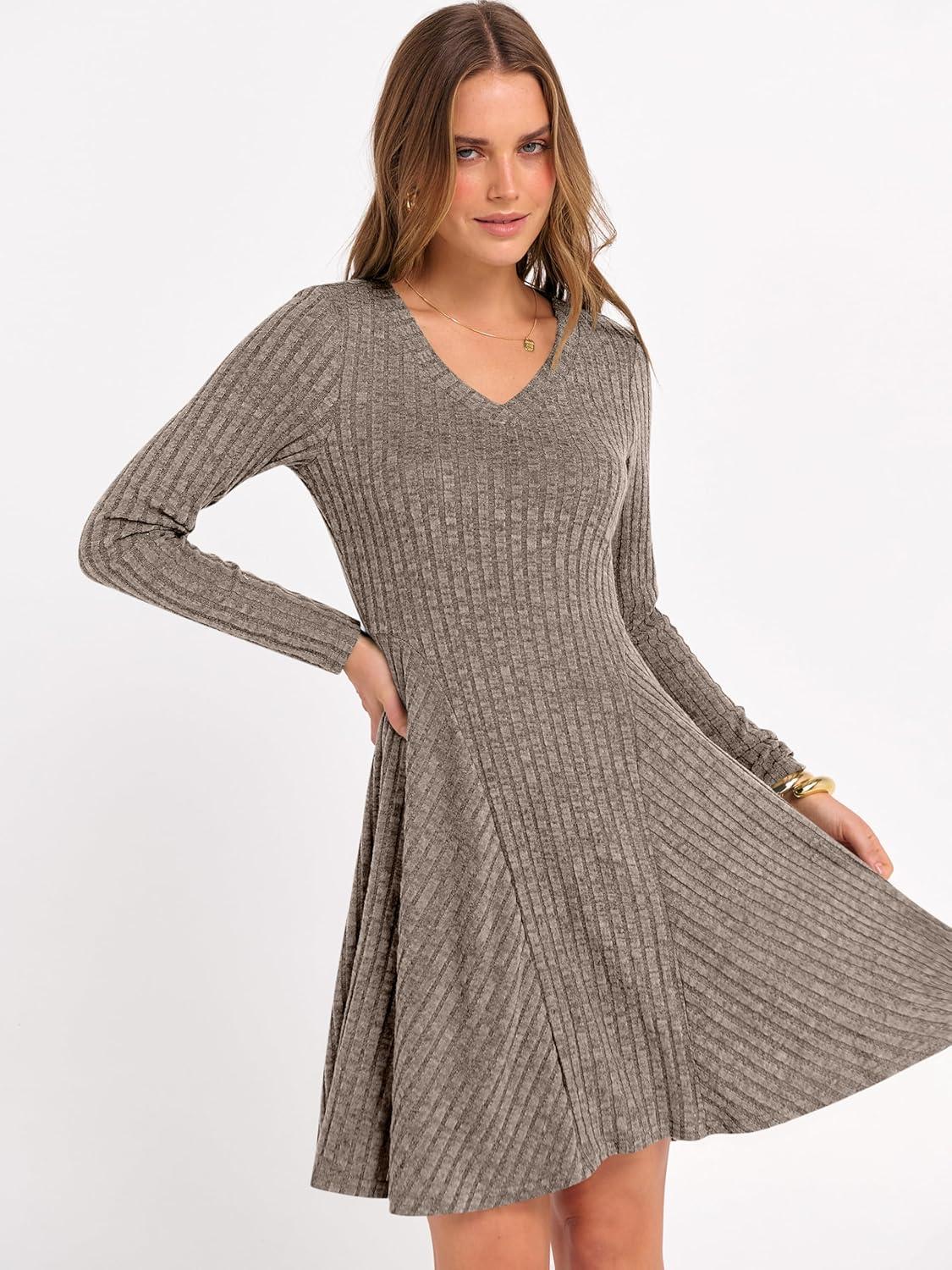 ANRABESS Women Long Sleeve Ribbed Knit Short Dresses 2026 Spring V Neck Casual Swing A Line Sweater Dress(Cool Ash Brown)