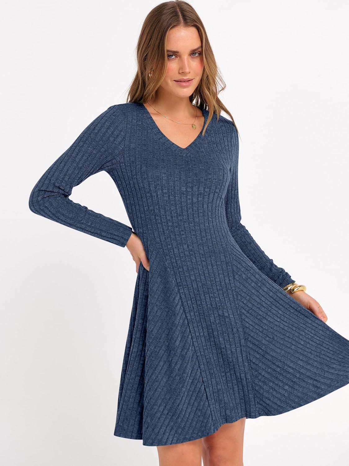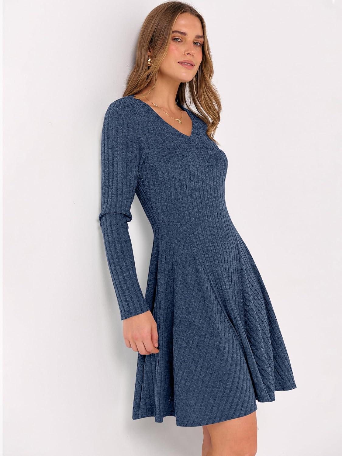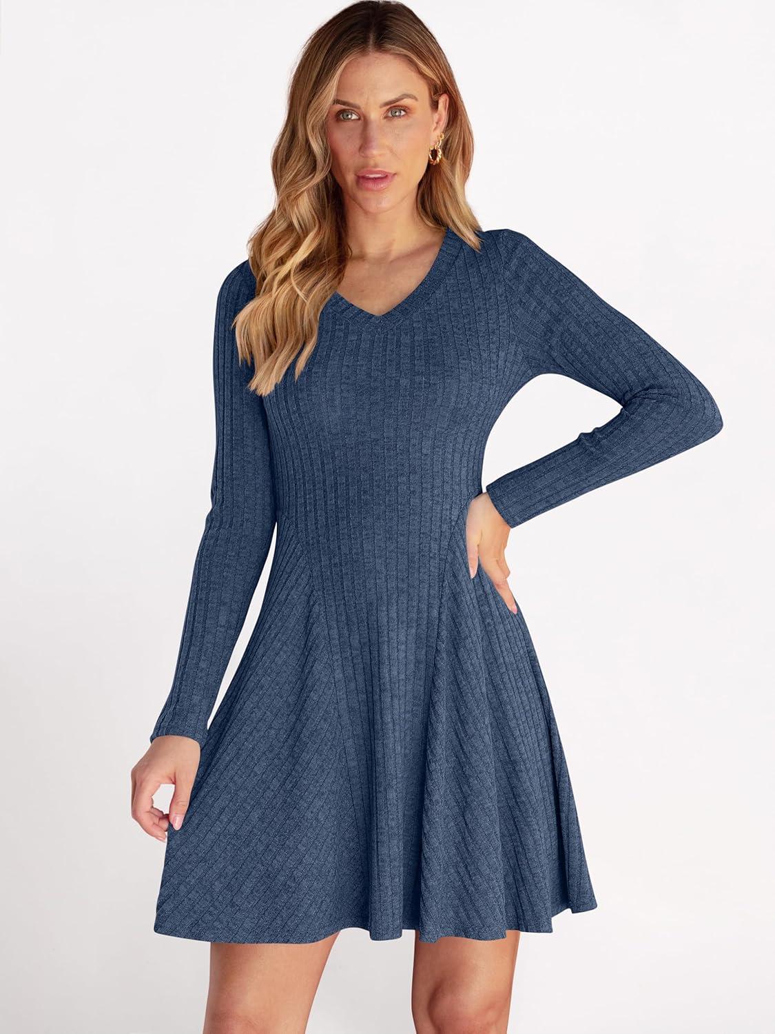 ANRABESS Women Long Sleeve Ribbed Knit Short Dresses 2026 Spring V Neck Casual Swing A Line Sweater Dress(Dark Blue)