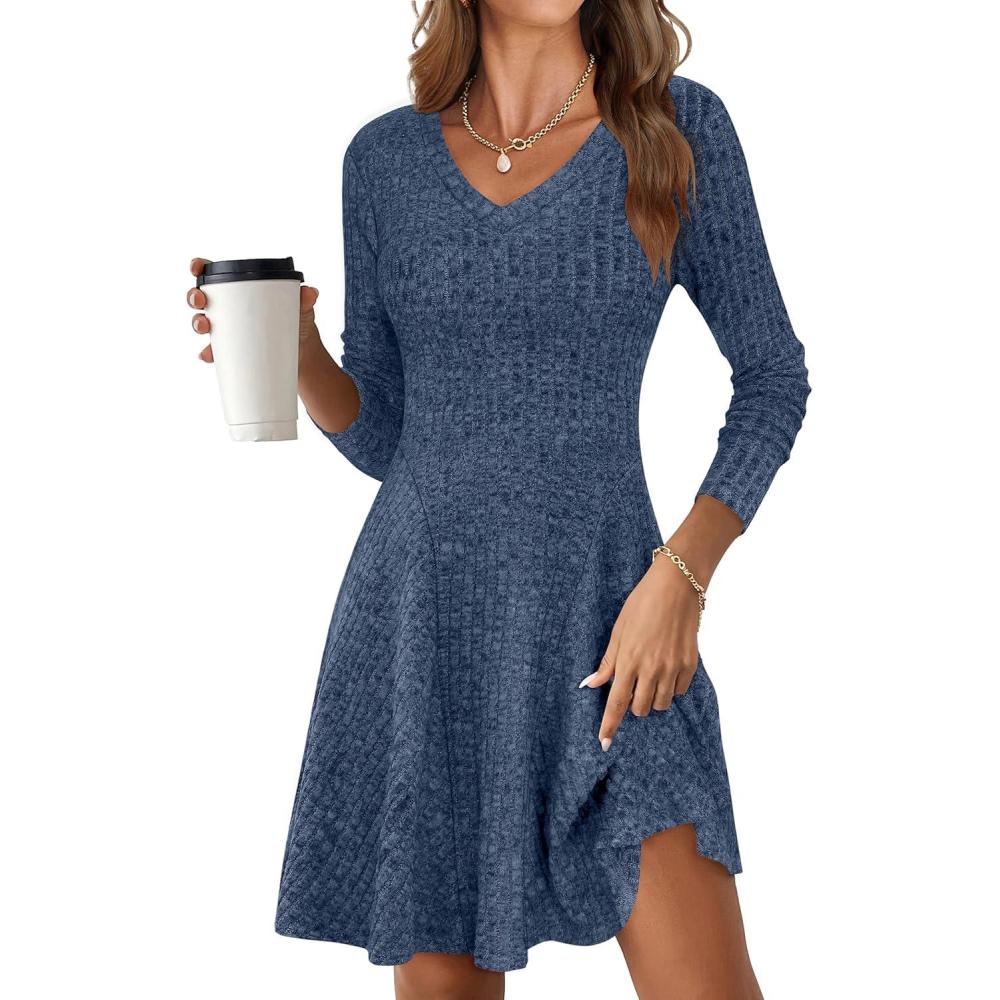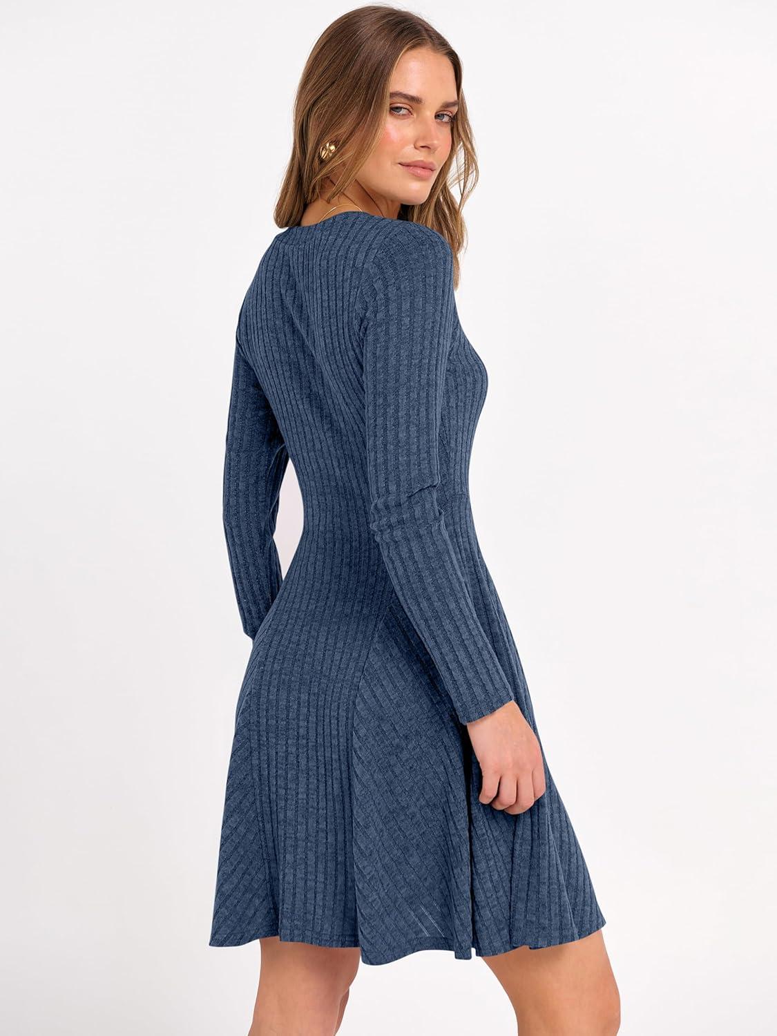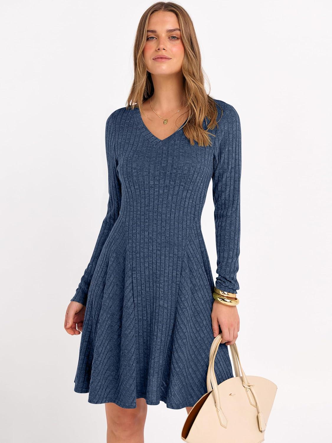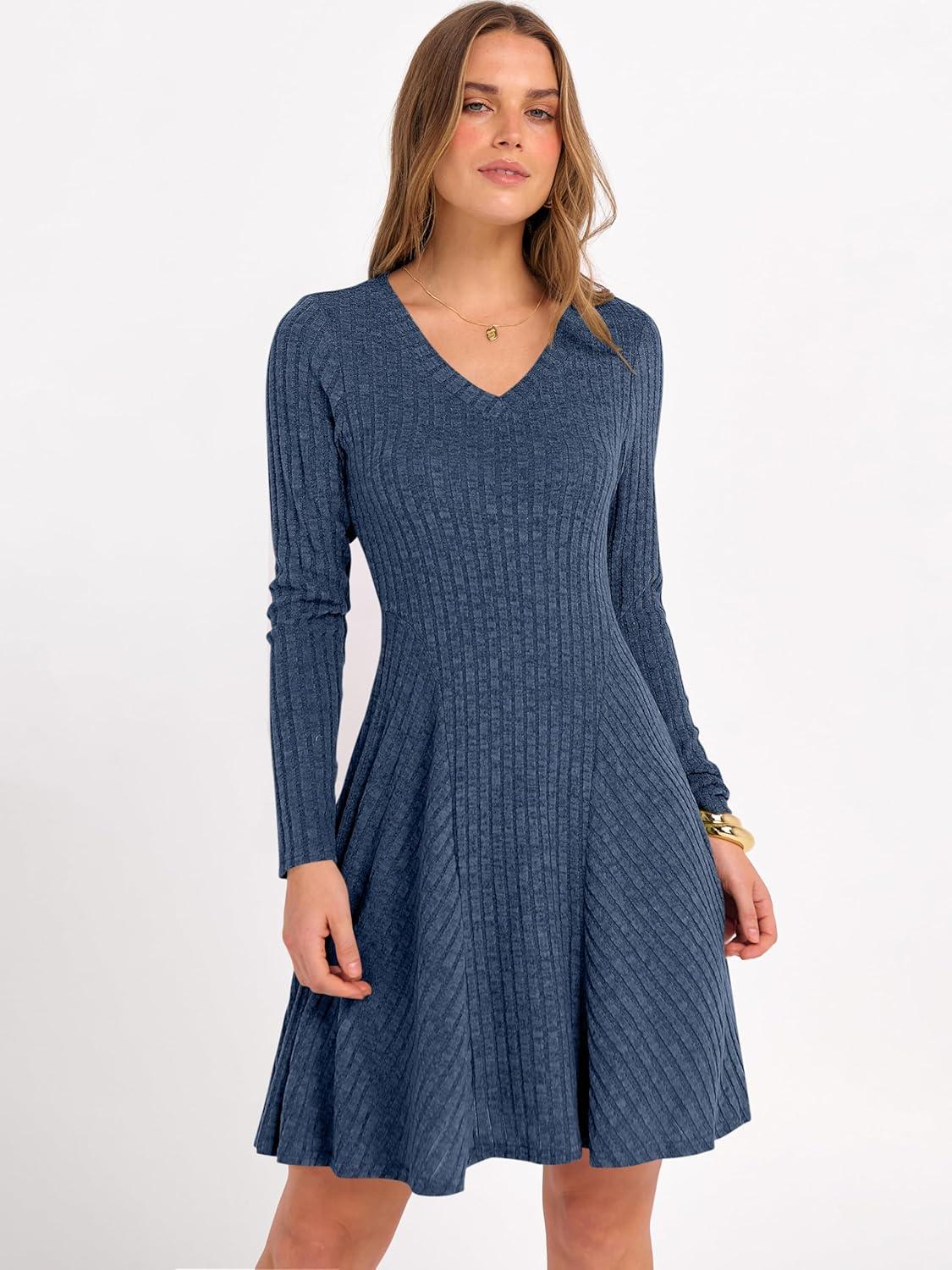 ANRABESS Women Long Sleeve Ribbed Knit Short Dresses 2026 Spring V Neck Casual Swing A Line Sweater Dress(Dark Blue)