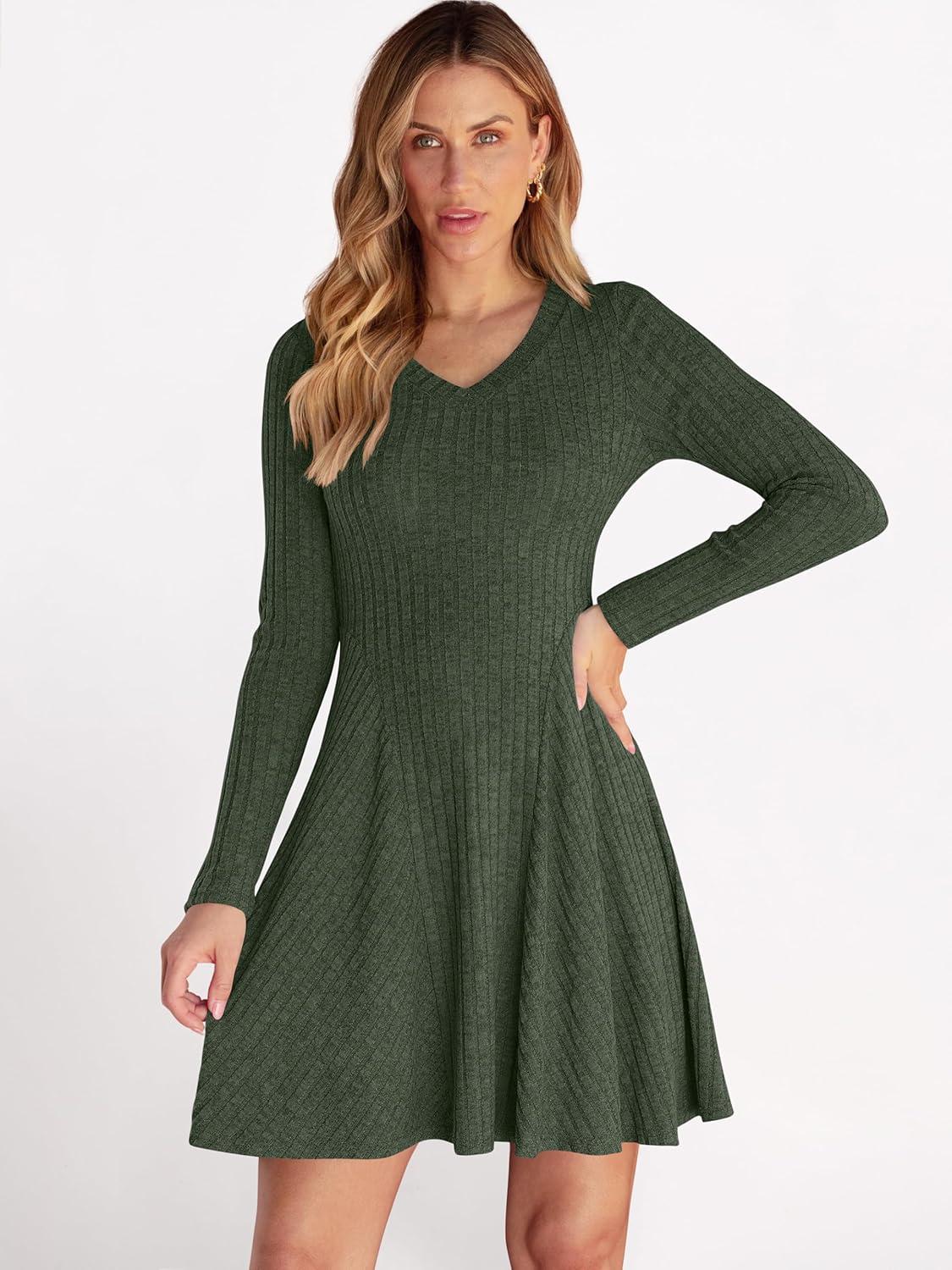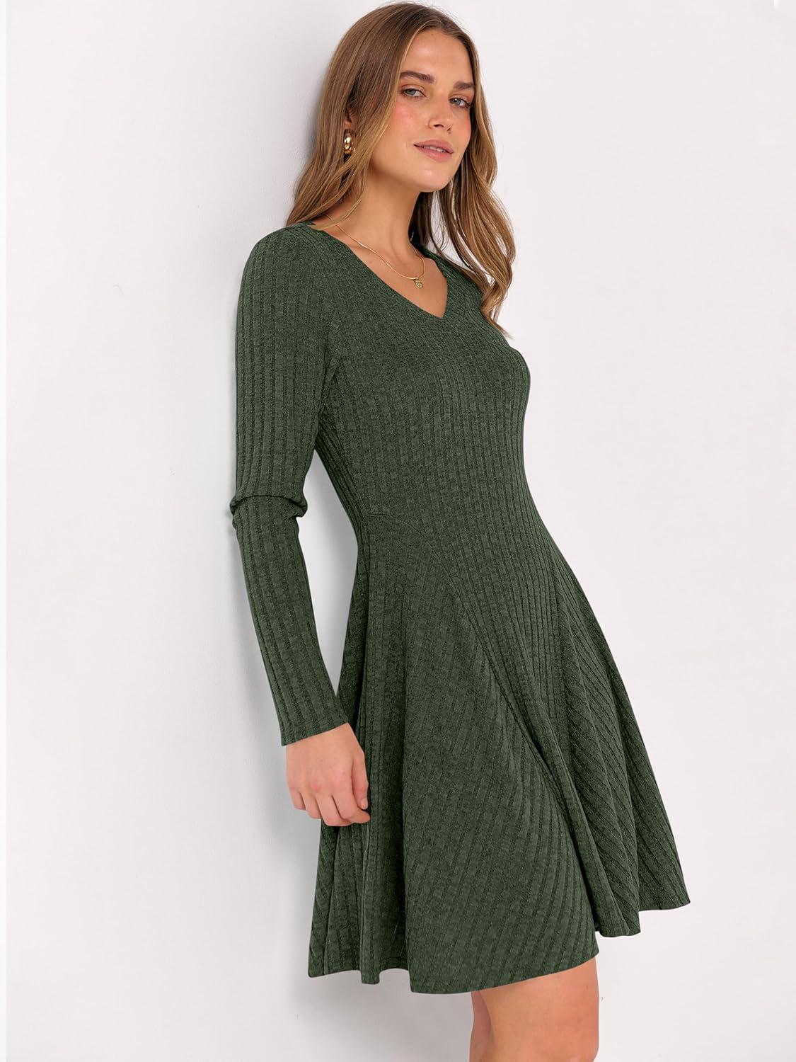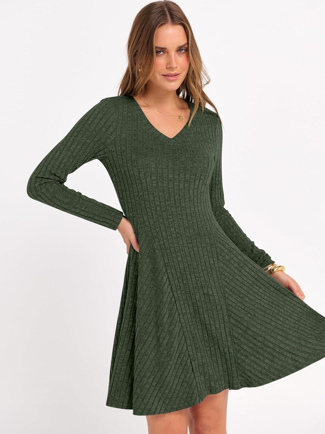 ANRABESS Women Long Sleeve Ribbed Knit Short Dresses 2026 Spring V Neck Casual Swing A Line Sweater Dress(Deep Green)