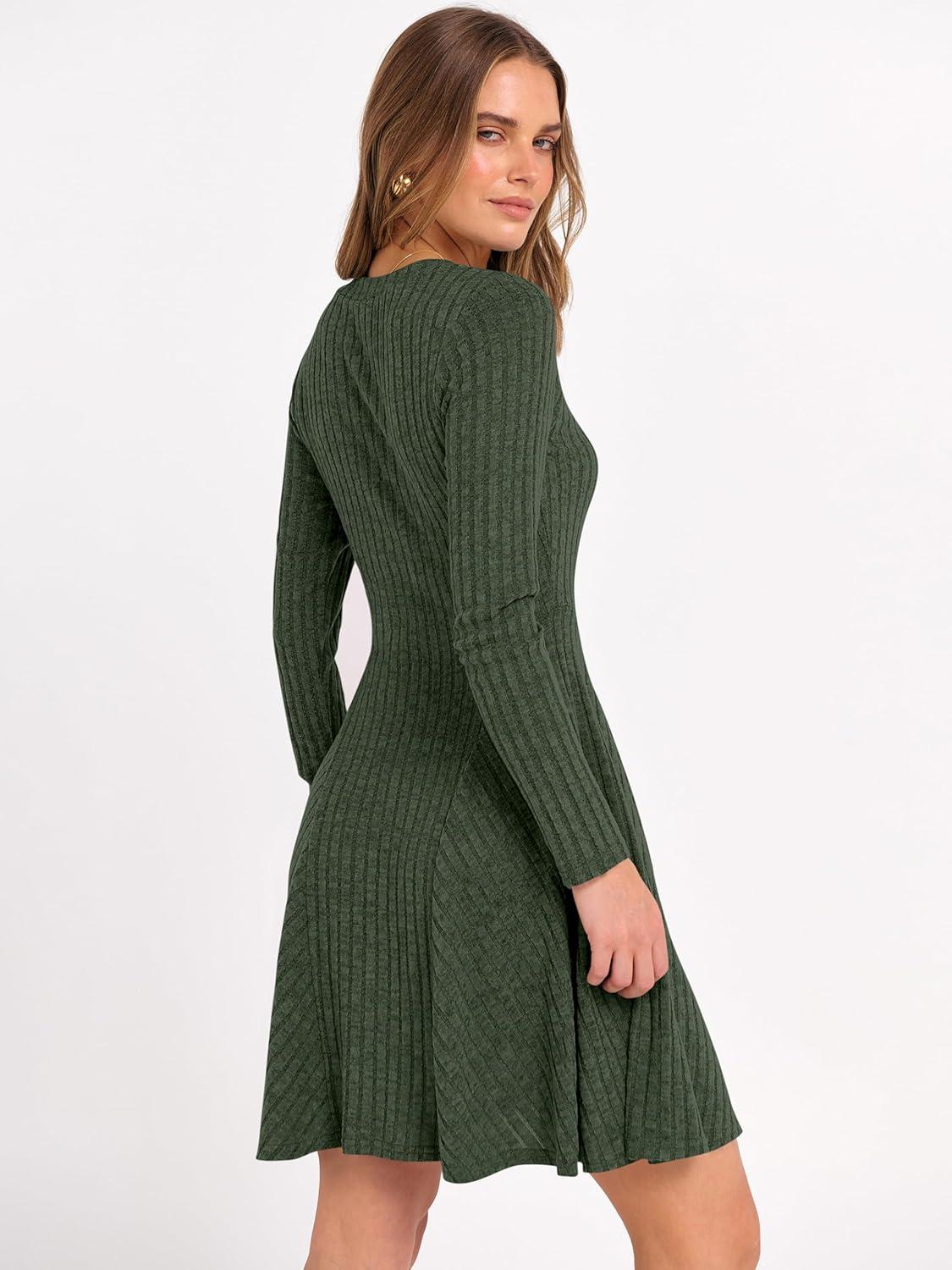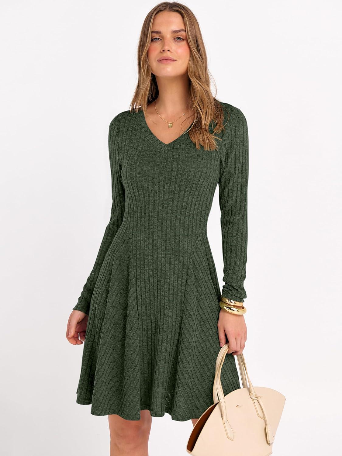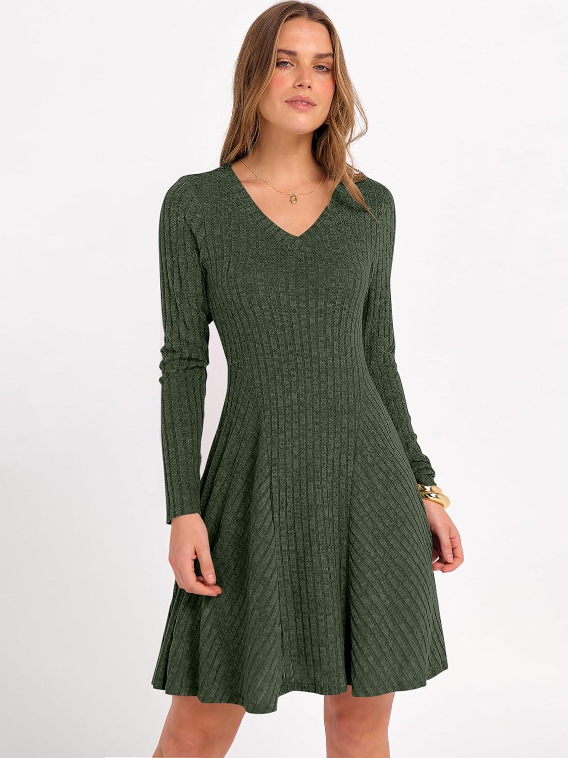 imageANRABESS Women Long Sleeve Ribbed Knit Short Dresses 2026 Spring V Neck Casual Swing A Line Sweater DressDeep Green