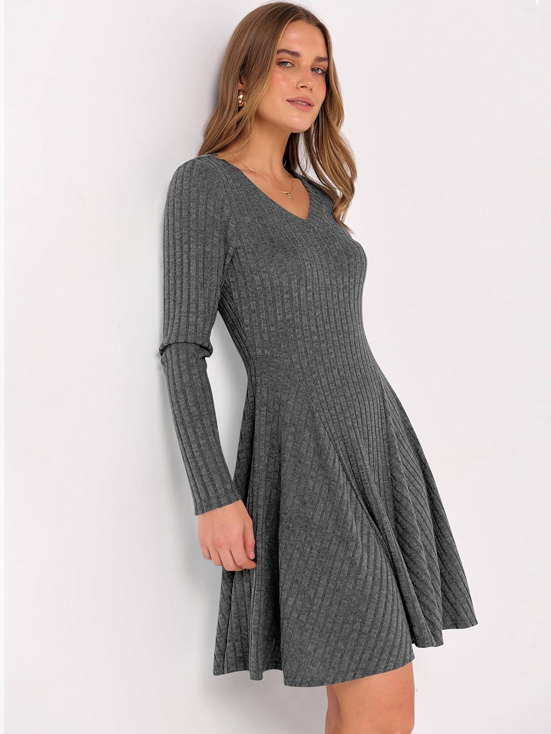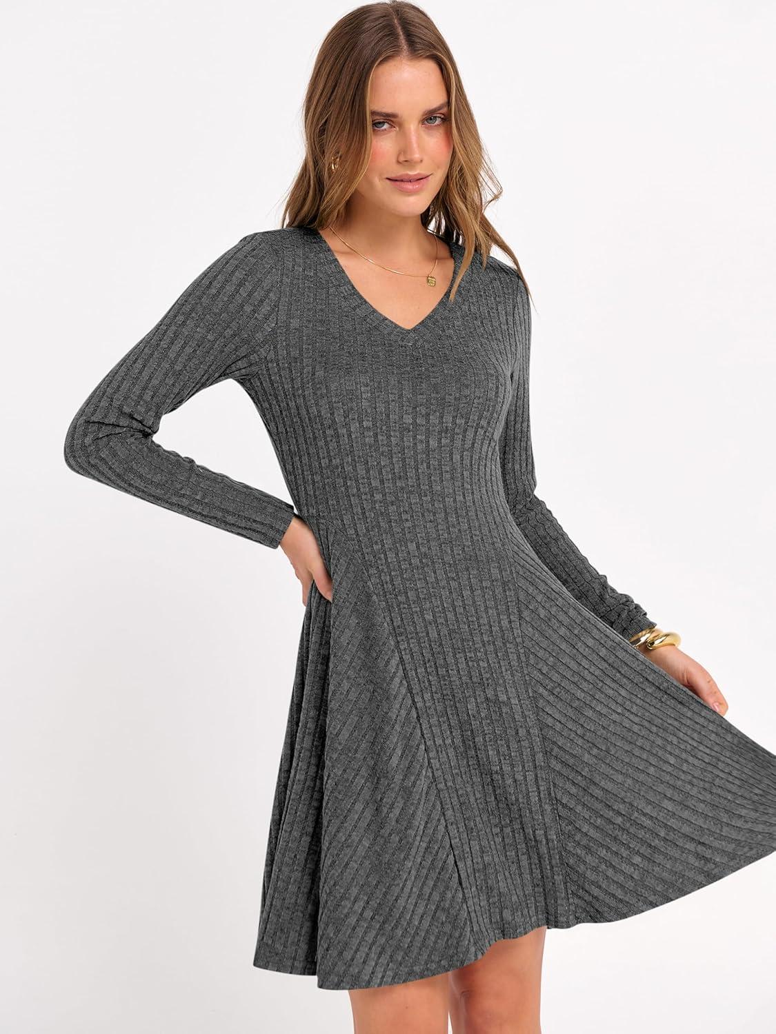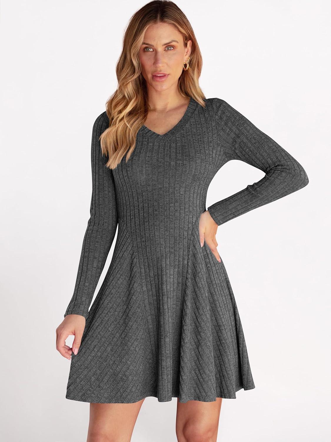 ANRABESS Women Long Sleeve Ribbed Knit Short Dresses 2026 Spring V Neck Casual Swing A Line Sweater Dress(Deep Grey)