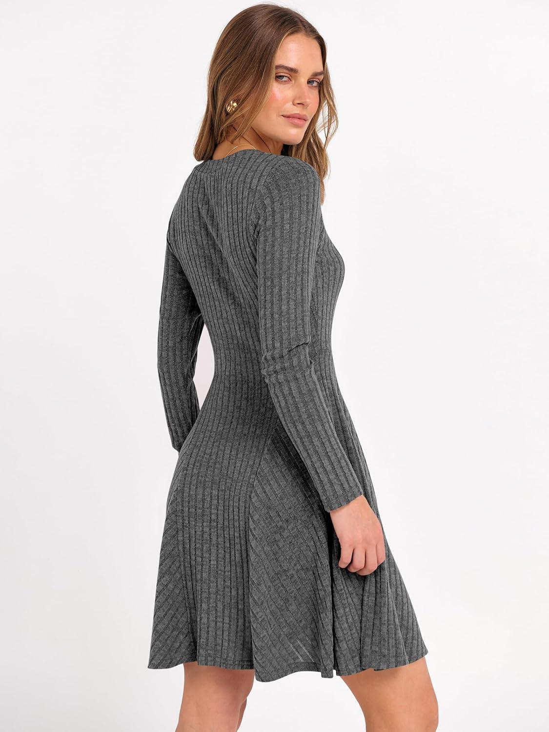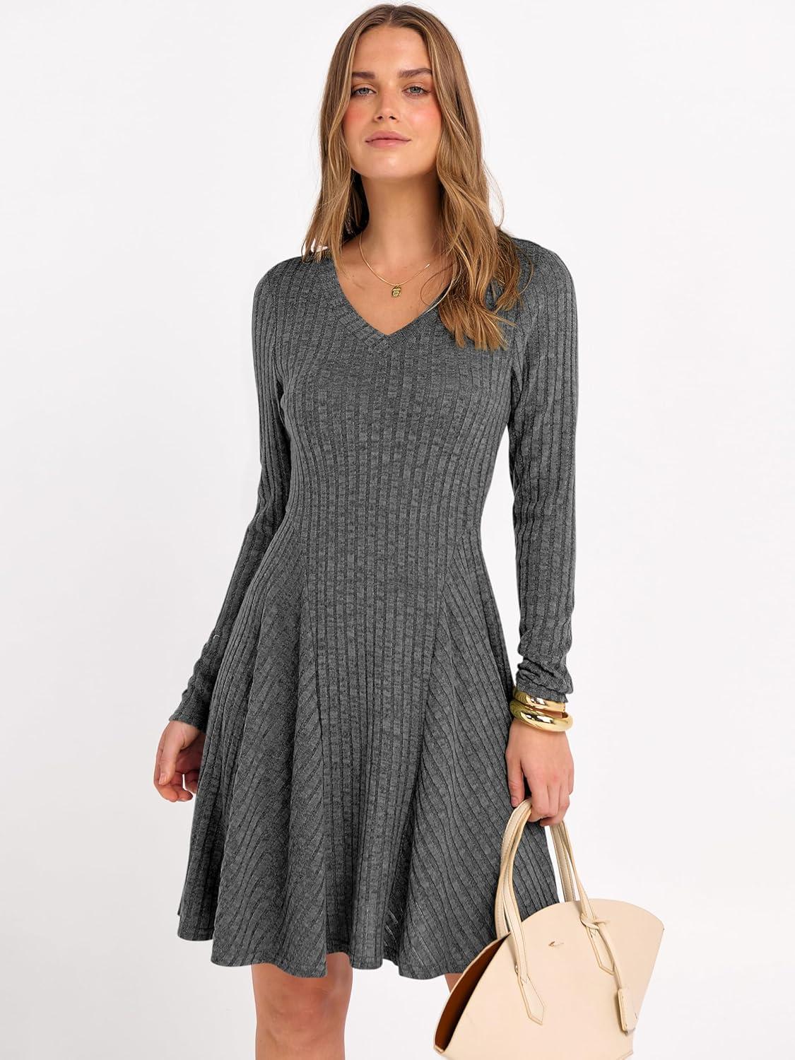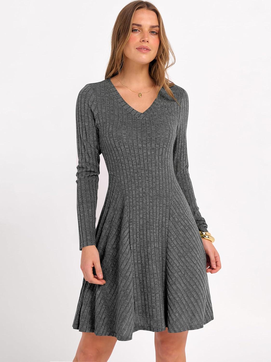 ANRABESS Women Long Sleeve Ribbed Knit Short Dresses 2026 Spring V Neck Casual Swing A Line Sweater Dress(Deep Grey)