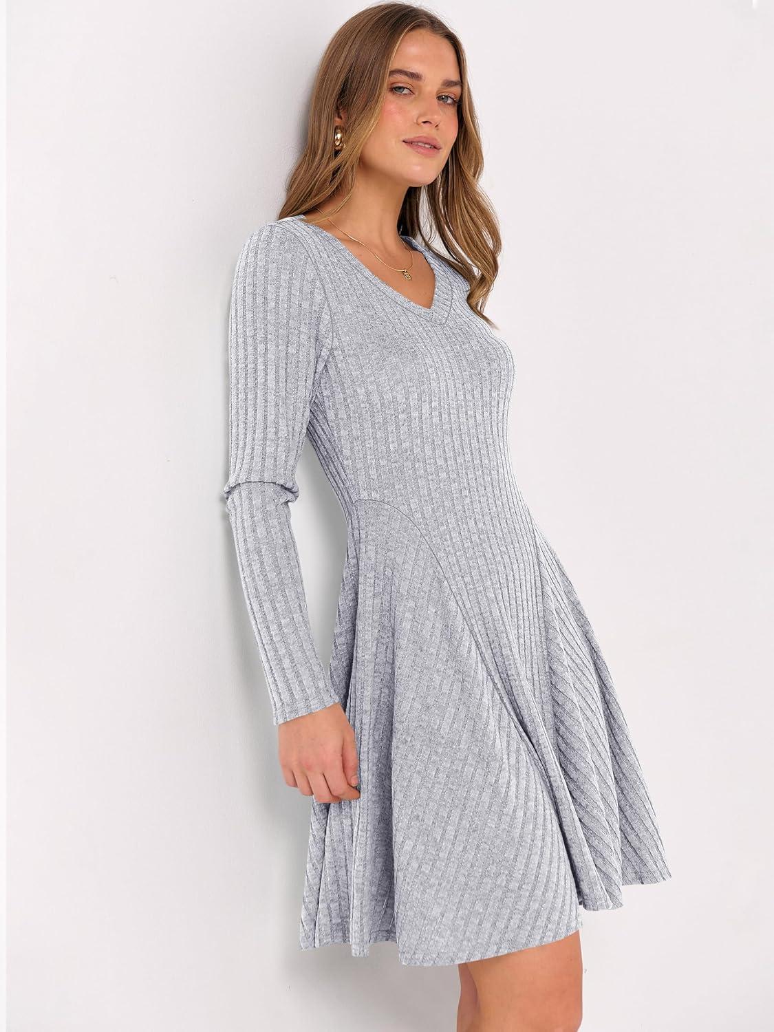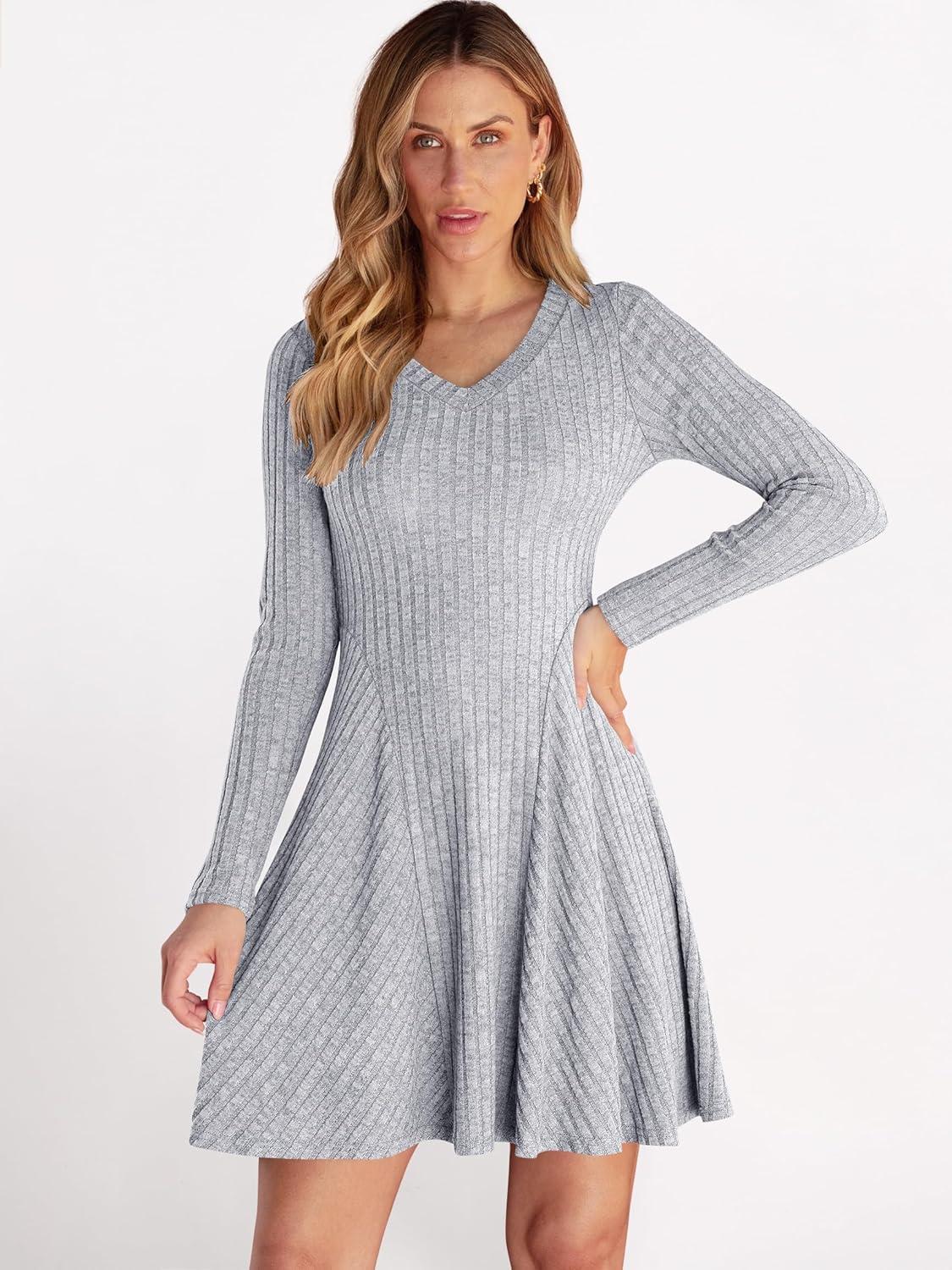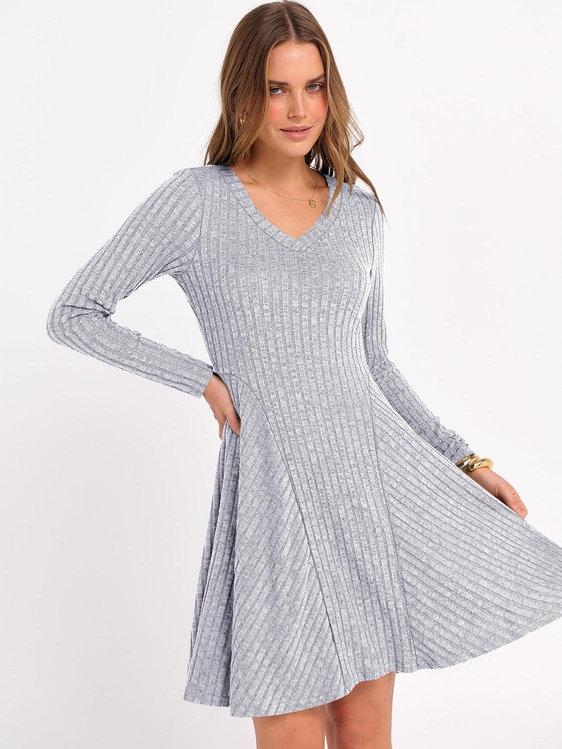 ANRABESS Women Long Sleeve Ribbed Knit Short Dresses 2026 Spring V Neck Casual Swing A Line Sweater Dress(Grey)