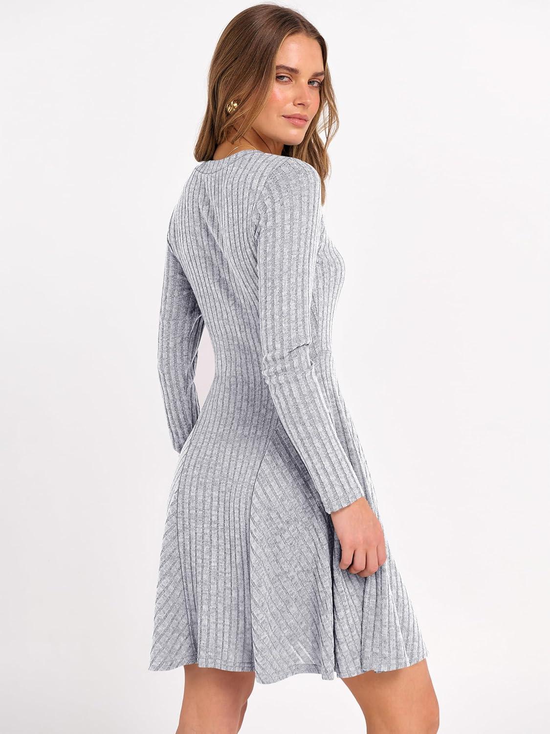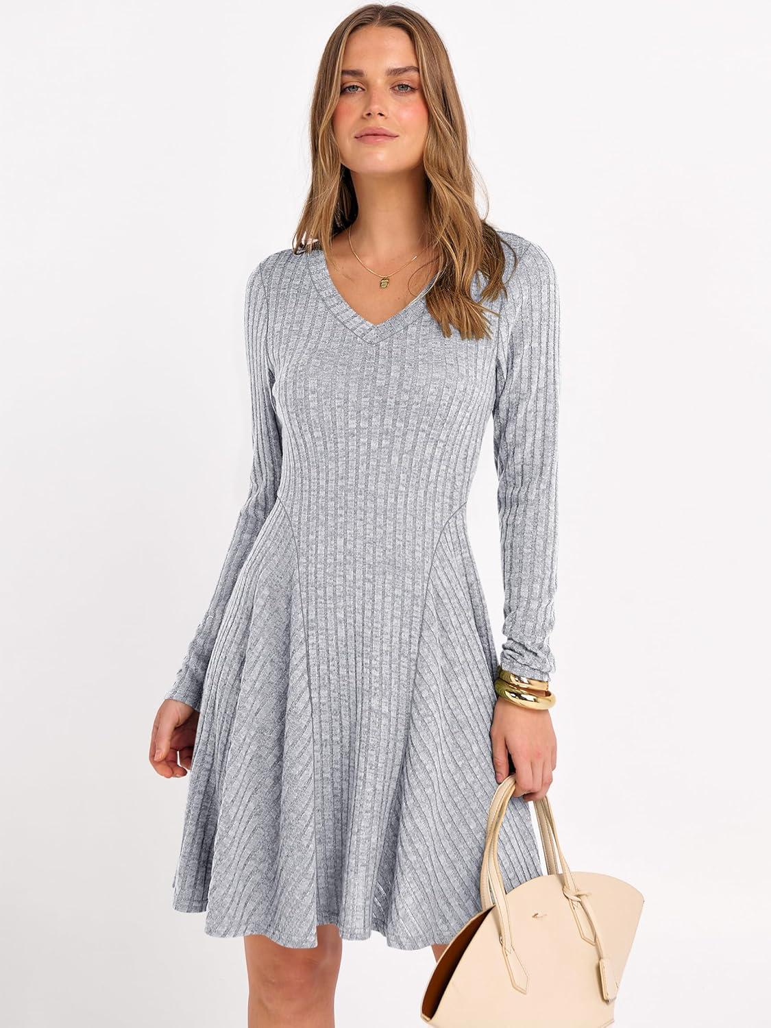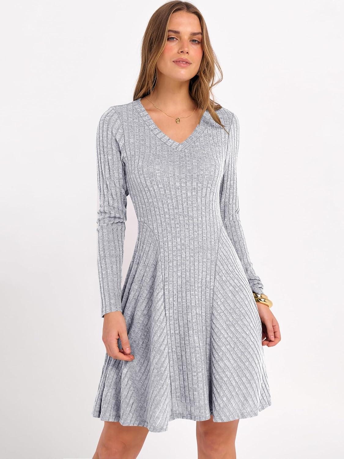 ANRABESS Women Long Sleeve Ribbed Knit Short Dresses 2026 Spring V Neck Casual Swing A Line Sweater Dress(Grey)