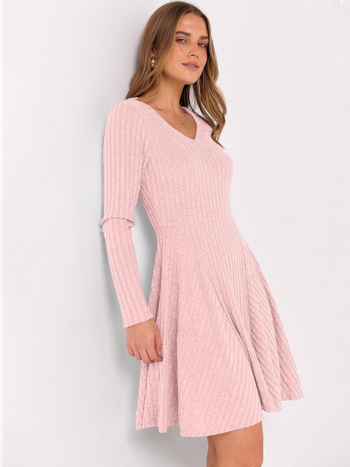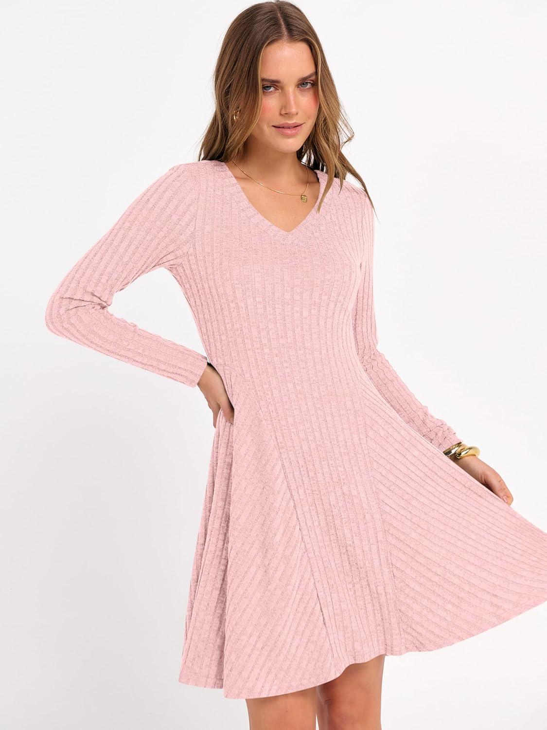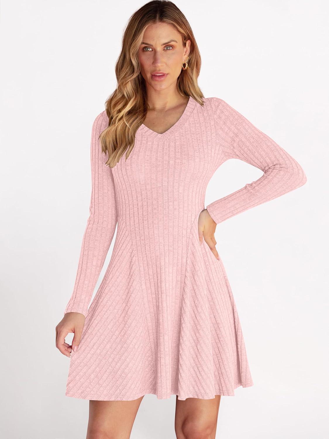 ANRABESS Women Long Sleeve Ribbed Knit Short Dresses 2026 Spring V Neck Casual Swing A Line Sweater Dress(Pink)