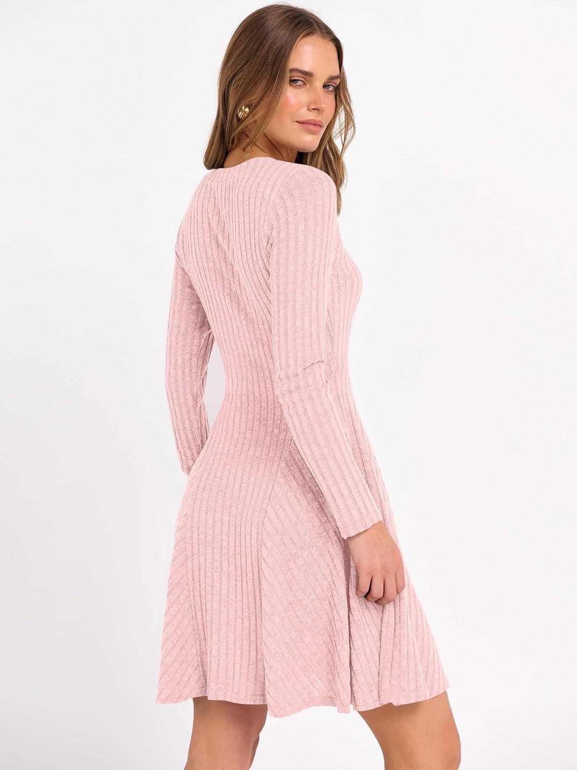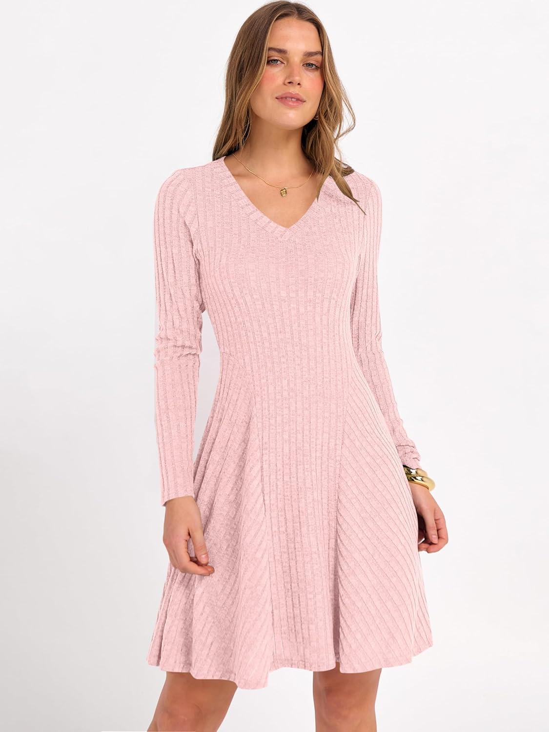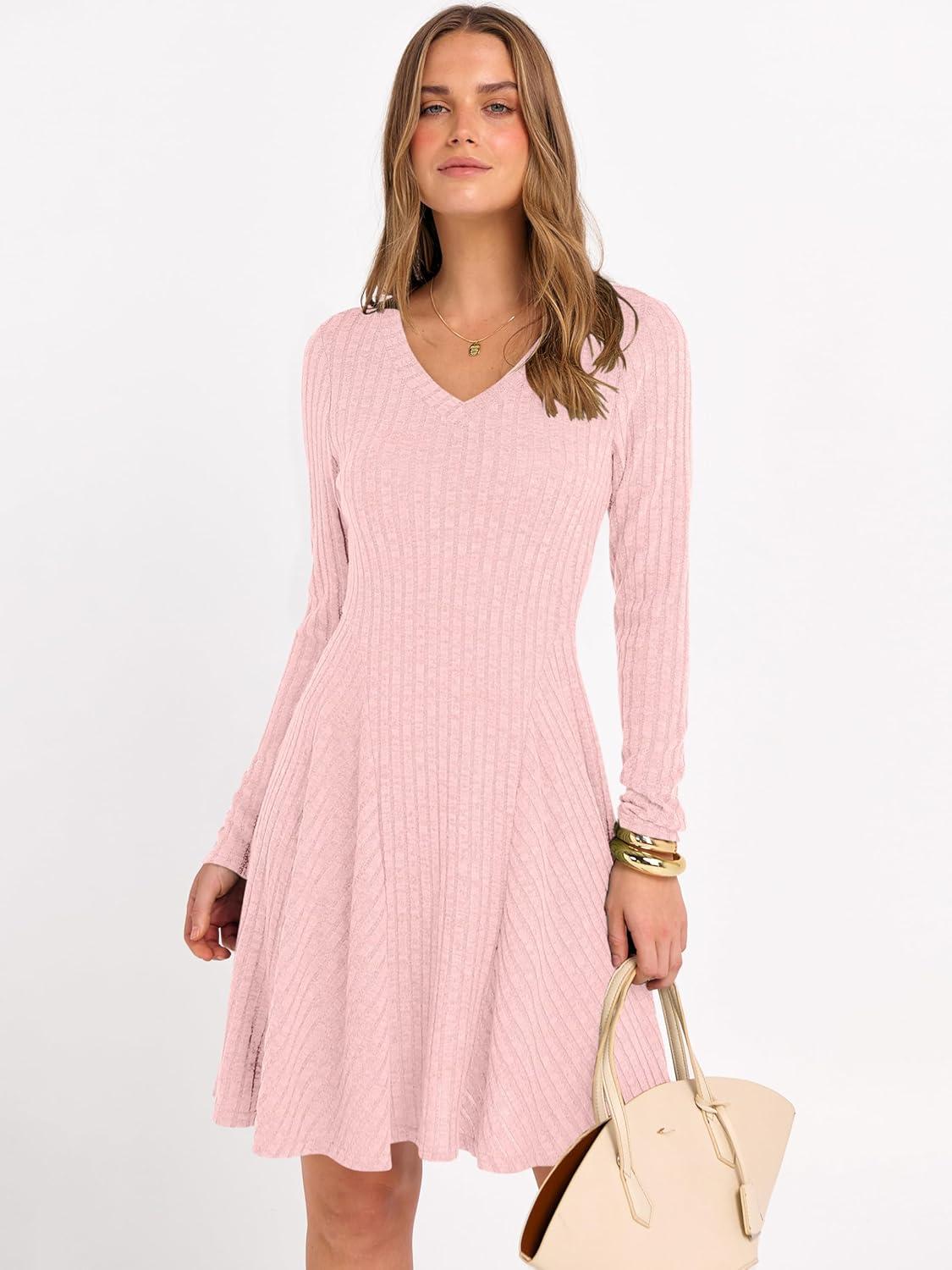 ANRABESS Women Long Sleeve Ribbed Knit Short Dresses 2026 Spring V Neck Casual Swing A Line Sweater Dress(Pink)
