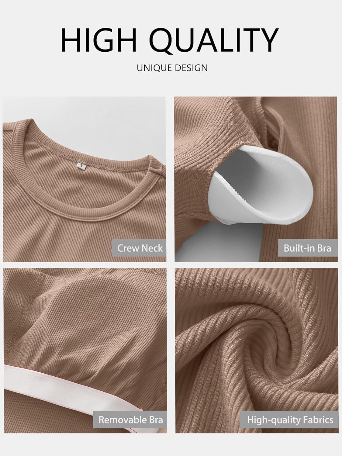 Women's Fall Long Sleeve T Shirts with Built-in Shelf Bra Crewneck Ribbed Knit Slim Fit Casual Basic Tee Tops