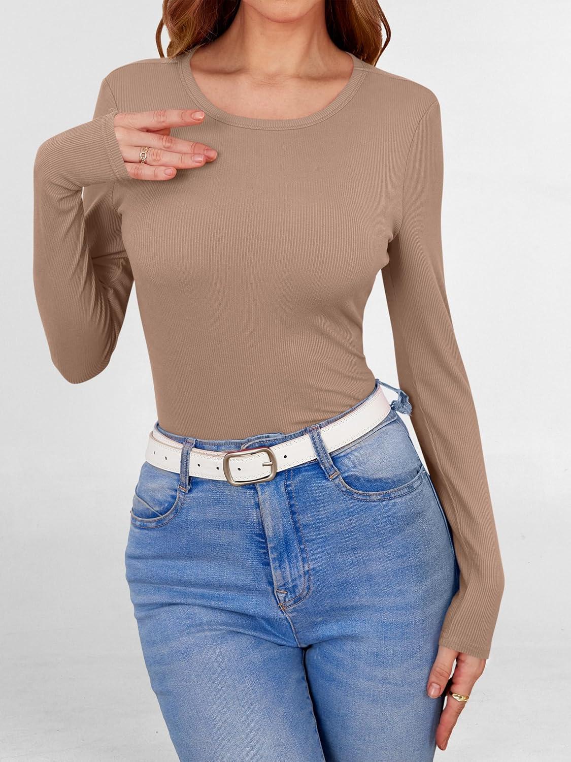 ANRABESS Women Long Sleeve Shirts Built-in Bra Crewneck Rib Knit Slim Fit Basic Tee Tops 2025 Fall Casual T-Shirt Base Layer(Light Camel)