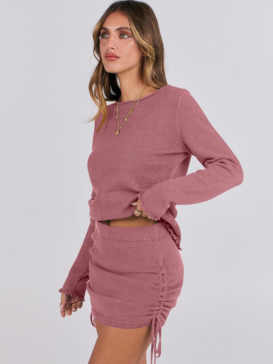 ANRABESS Women Long Sleeve Skirt Sets 2025 Fall Sweater Lounge Sets 2 Piece Beach Vacation Outfits(Deep Pink)