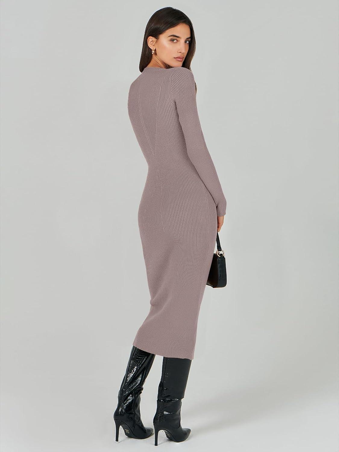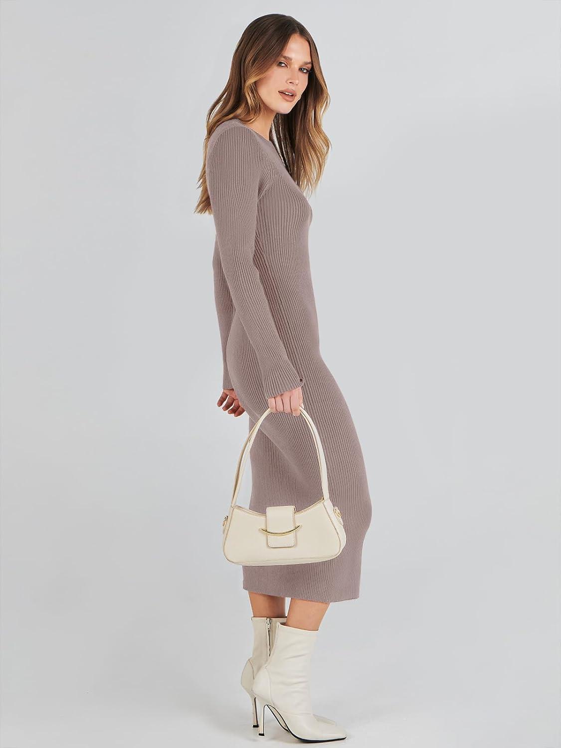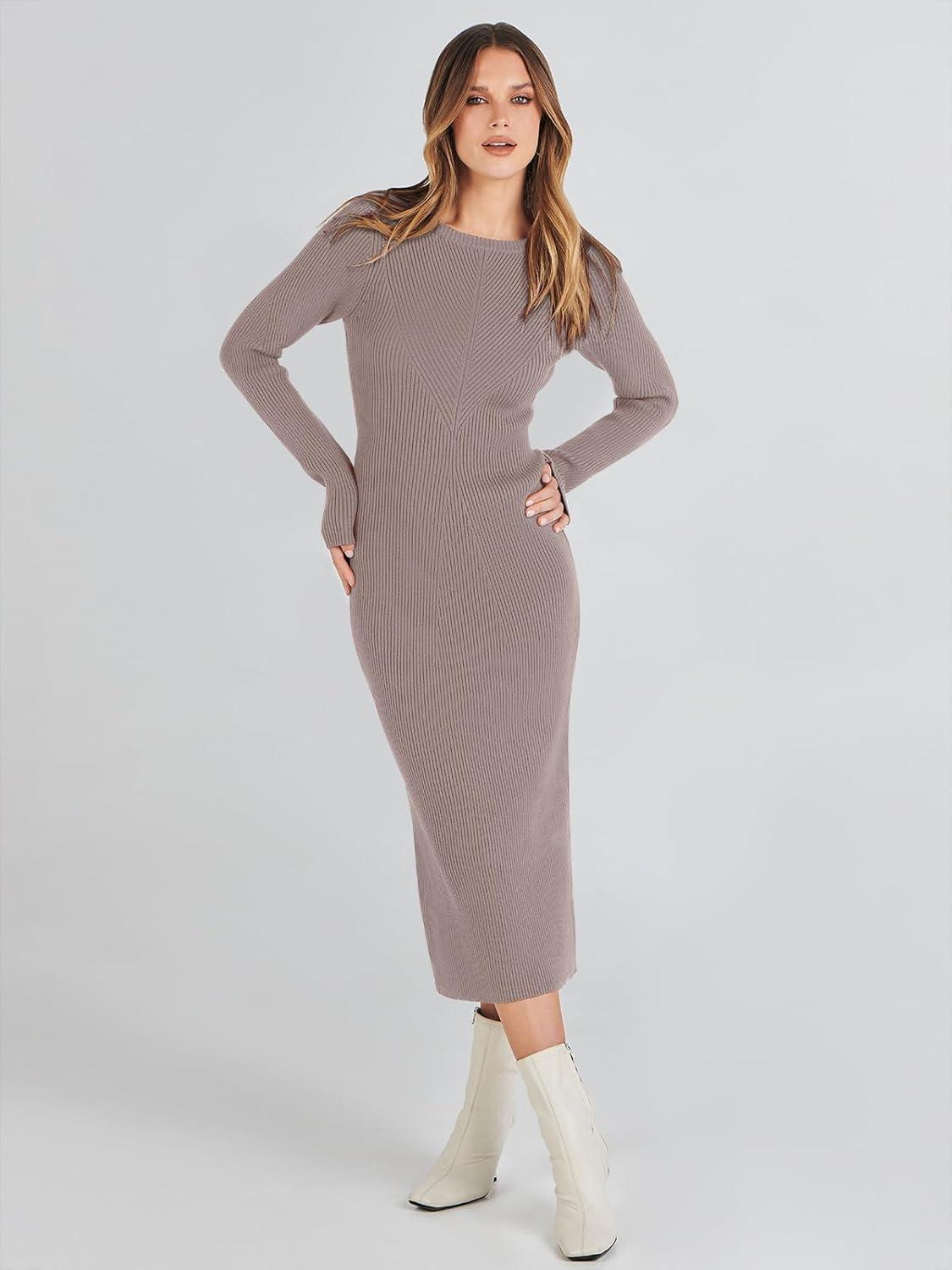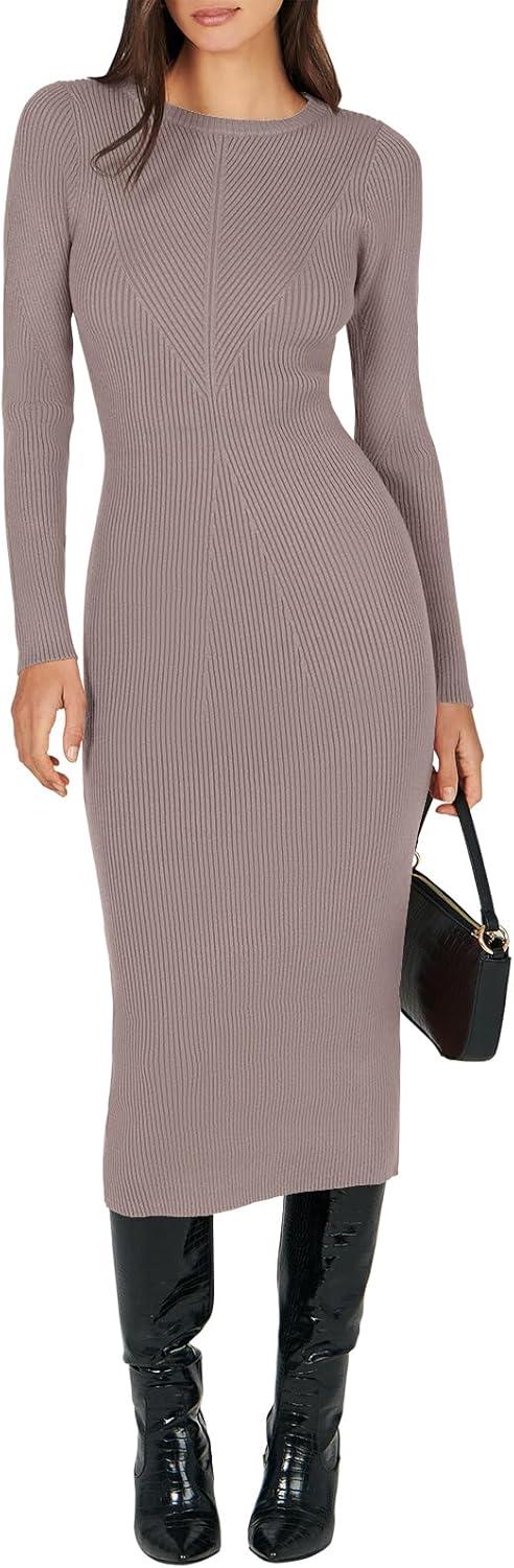 ANRABESS Women Long Sleeve Sweater Dress Crewneck Bodycon Stretch Slim Fit Ribbed Knit Midi Dresses 2025 Fall Trendy Outfits(Almond)