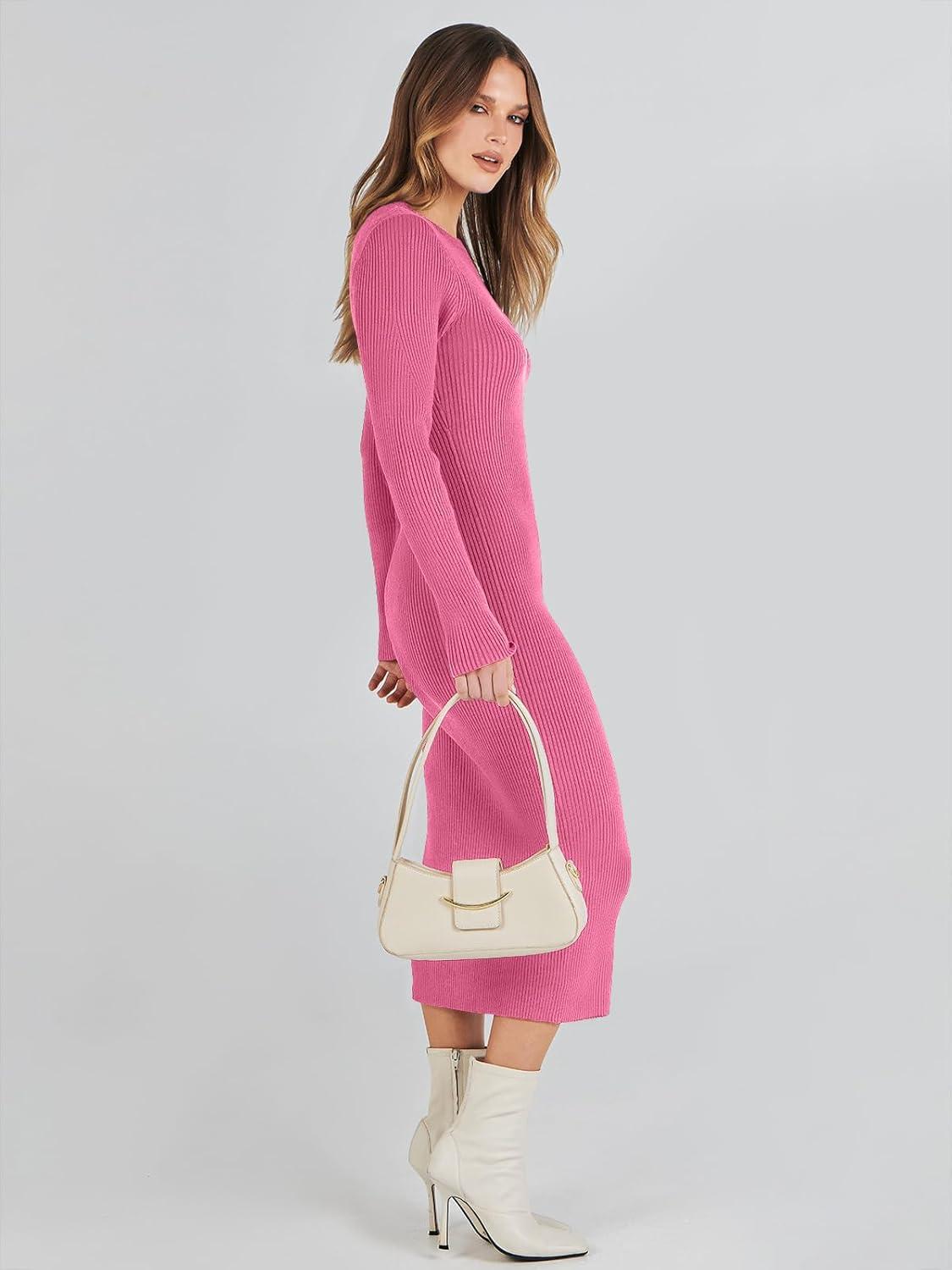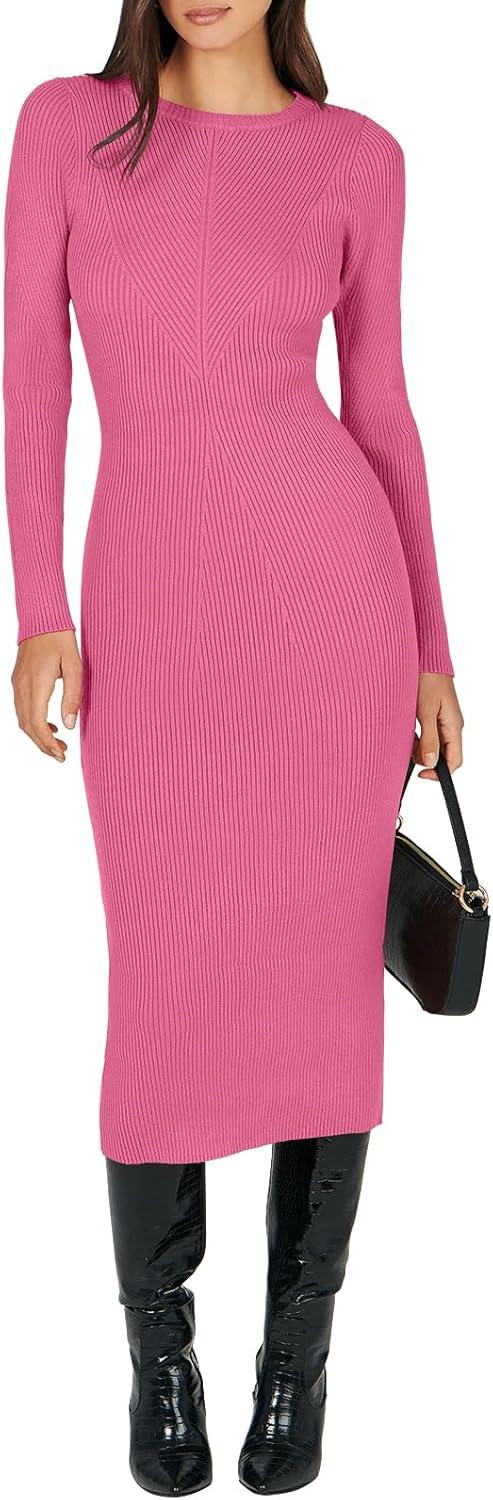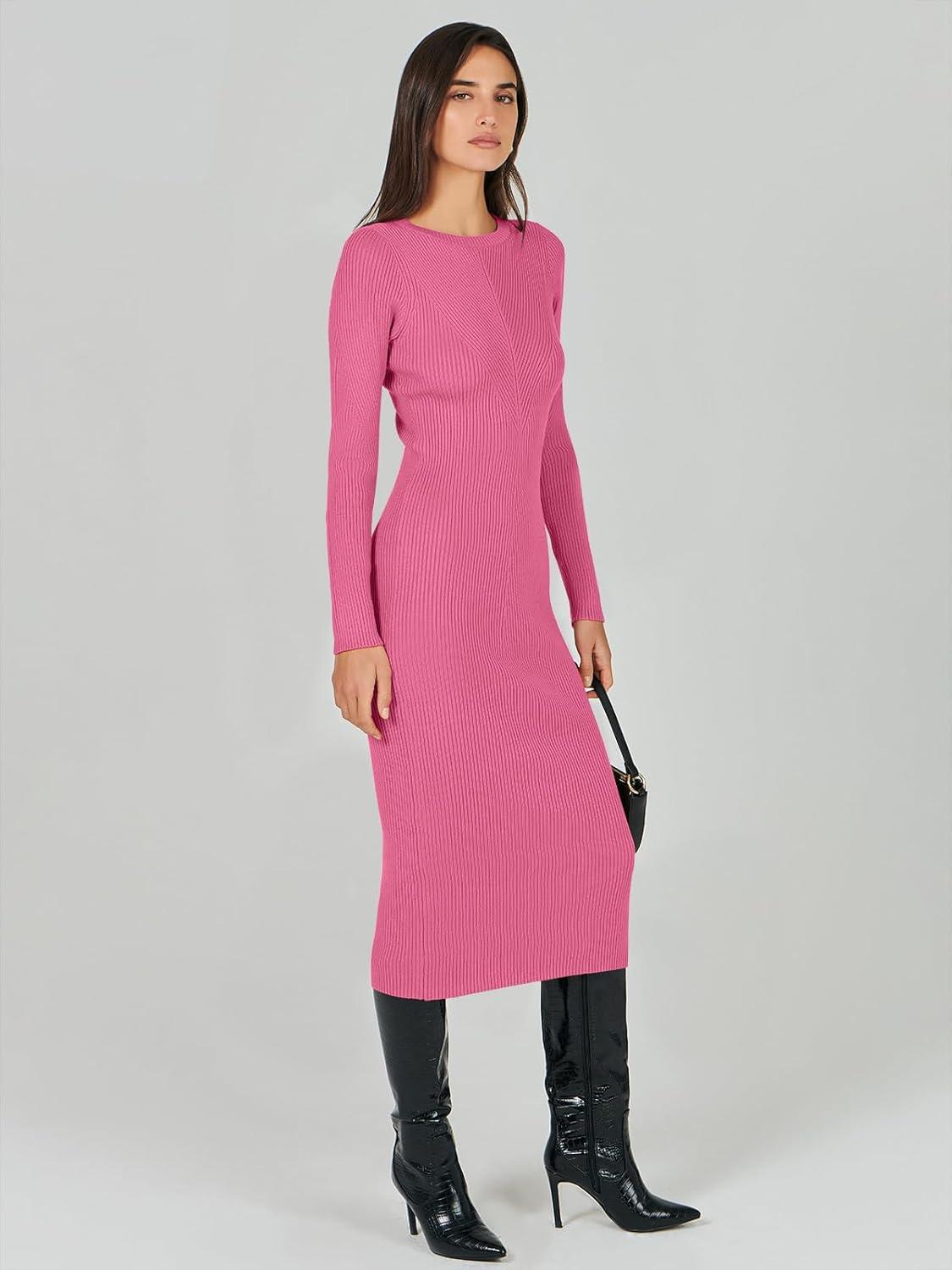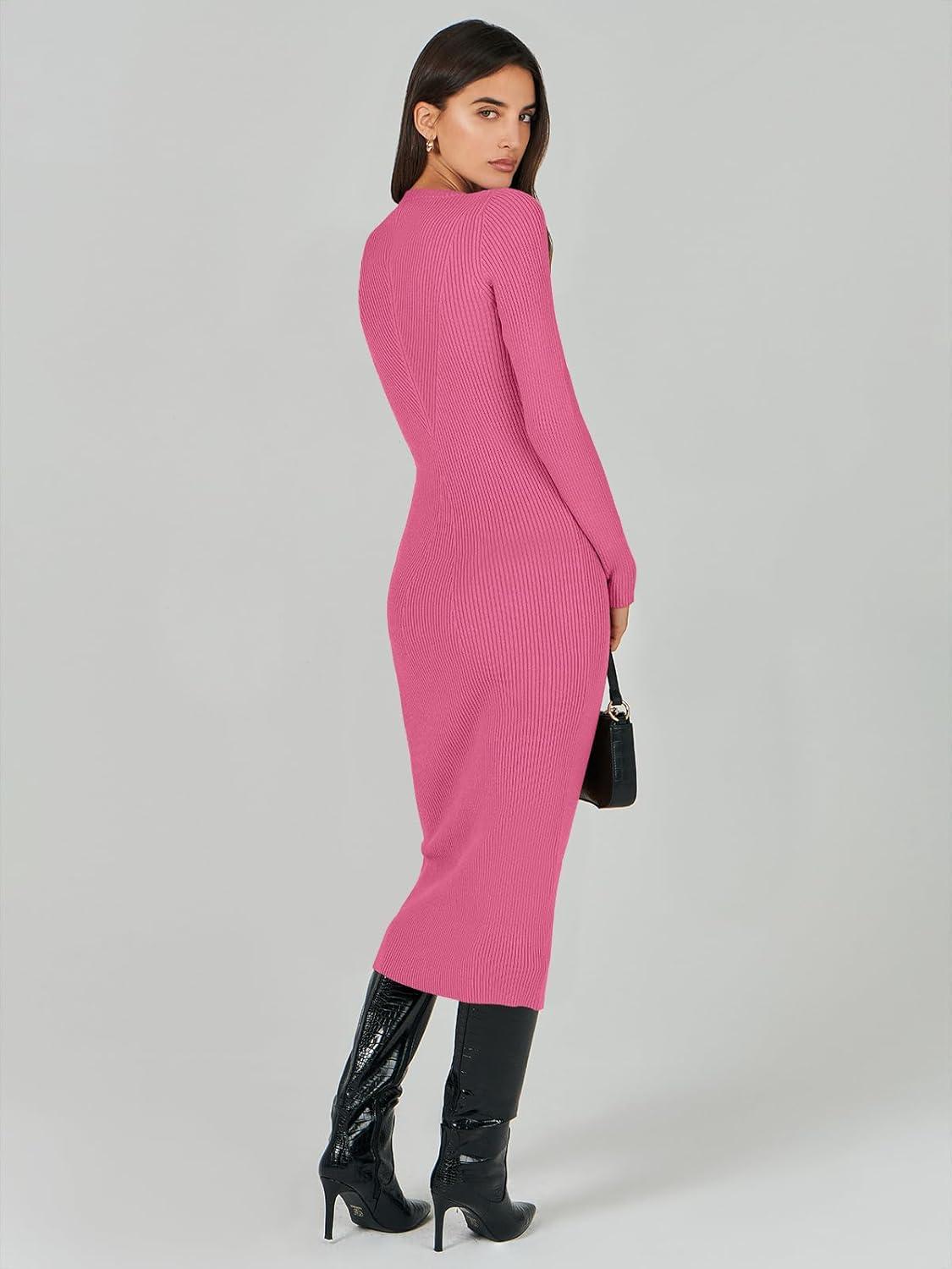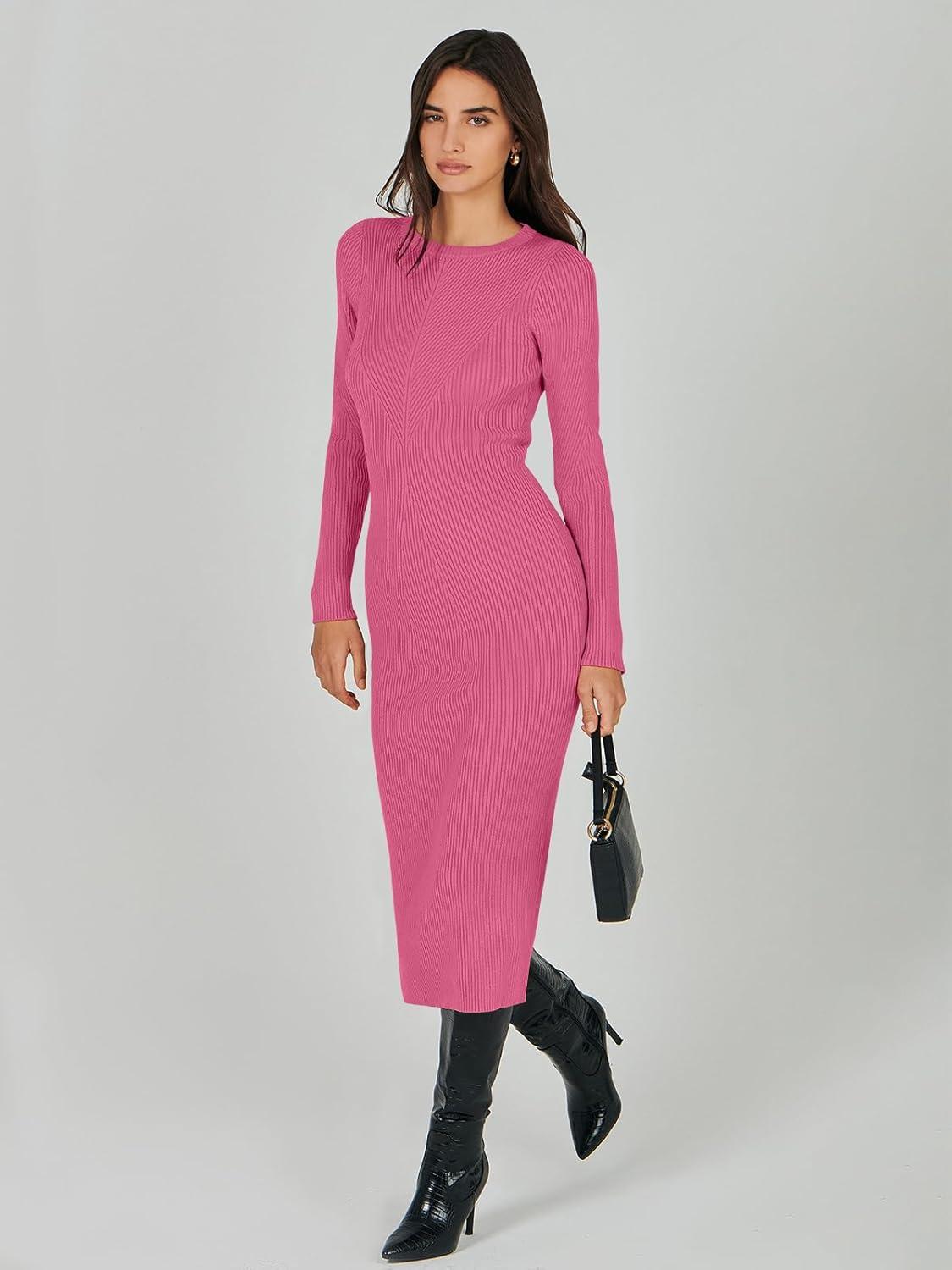 ANRABESS Women Long Sleeve Sweater Dress Crewneck Bodycon Stretch Slim Fit Ribbed Knit Midi Dresses 2025 Fall Trendy Outfits(Hot Pink)