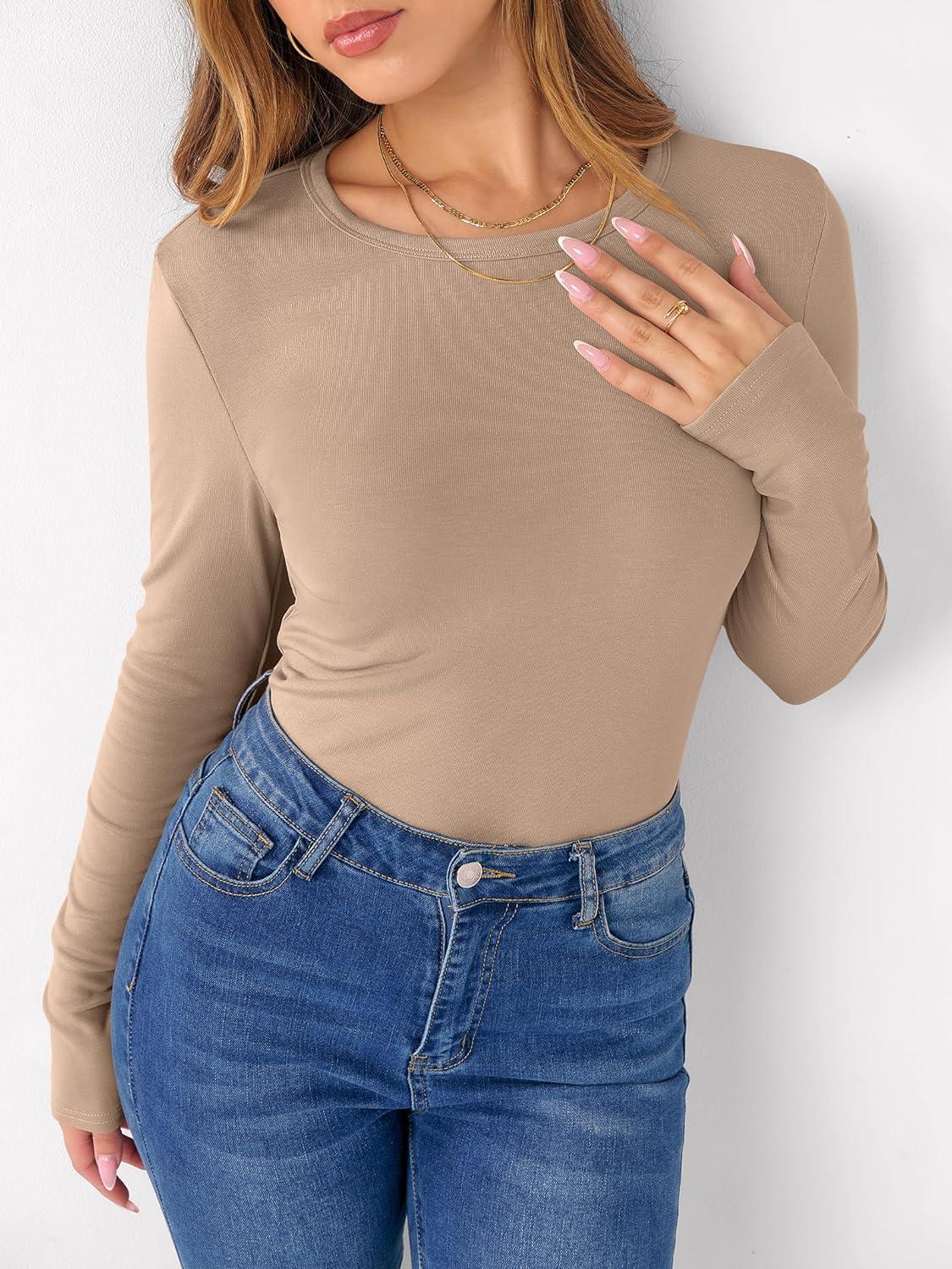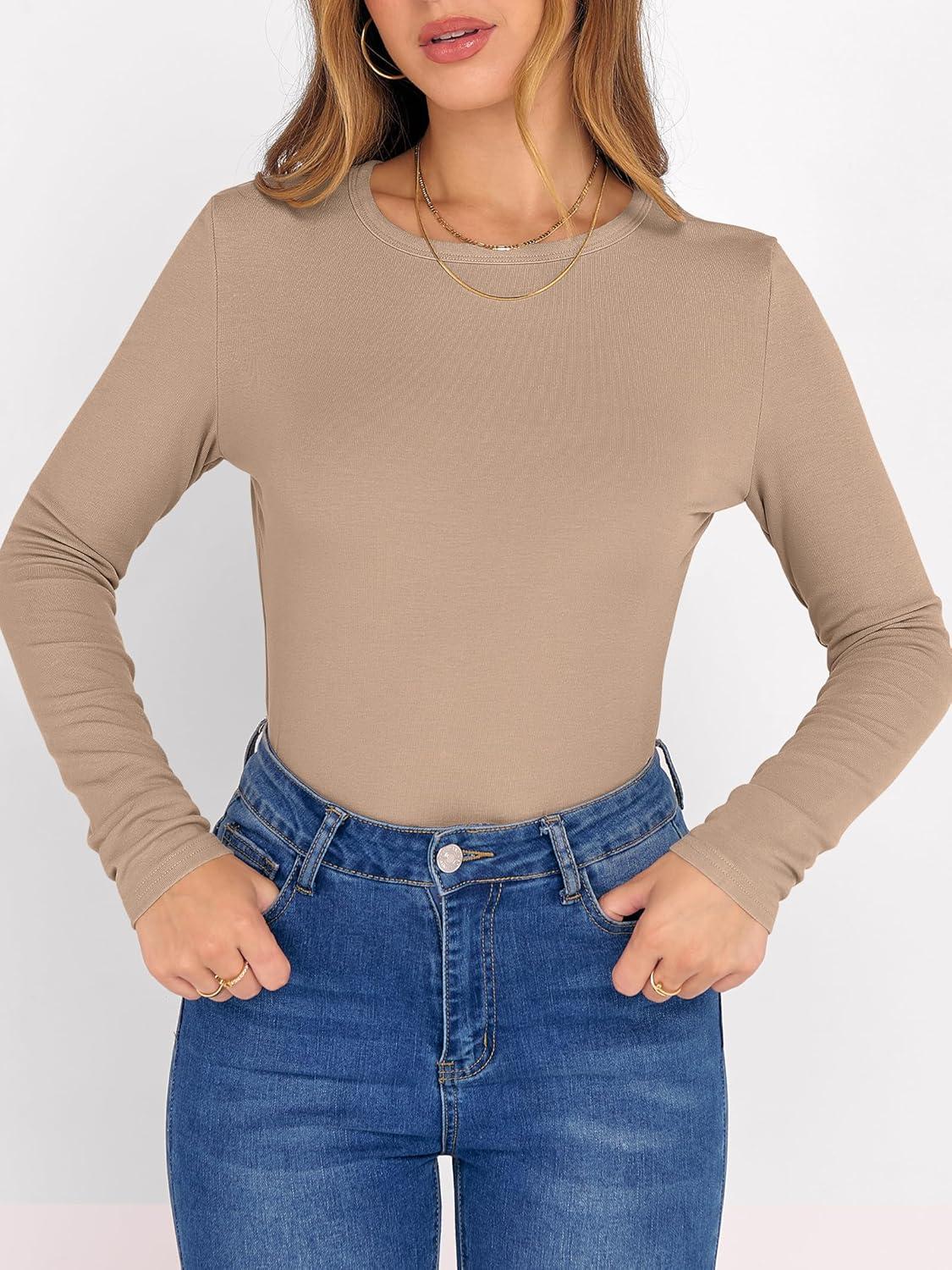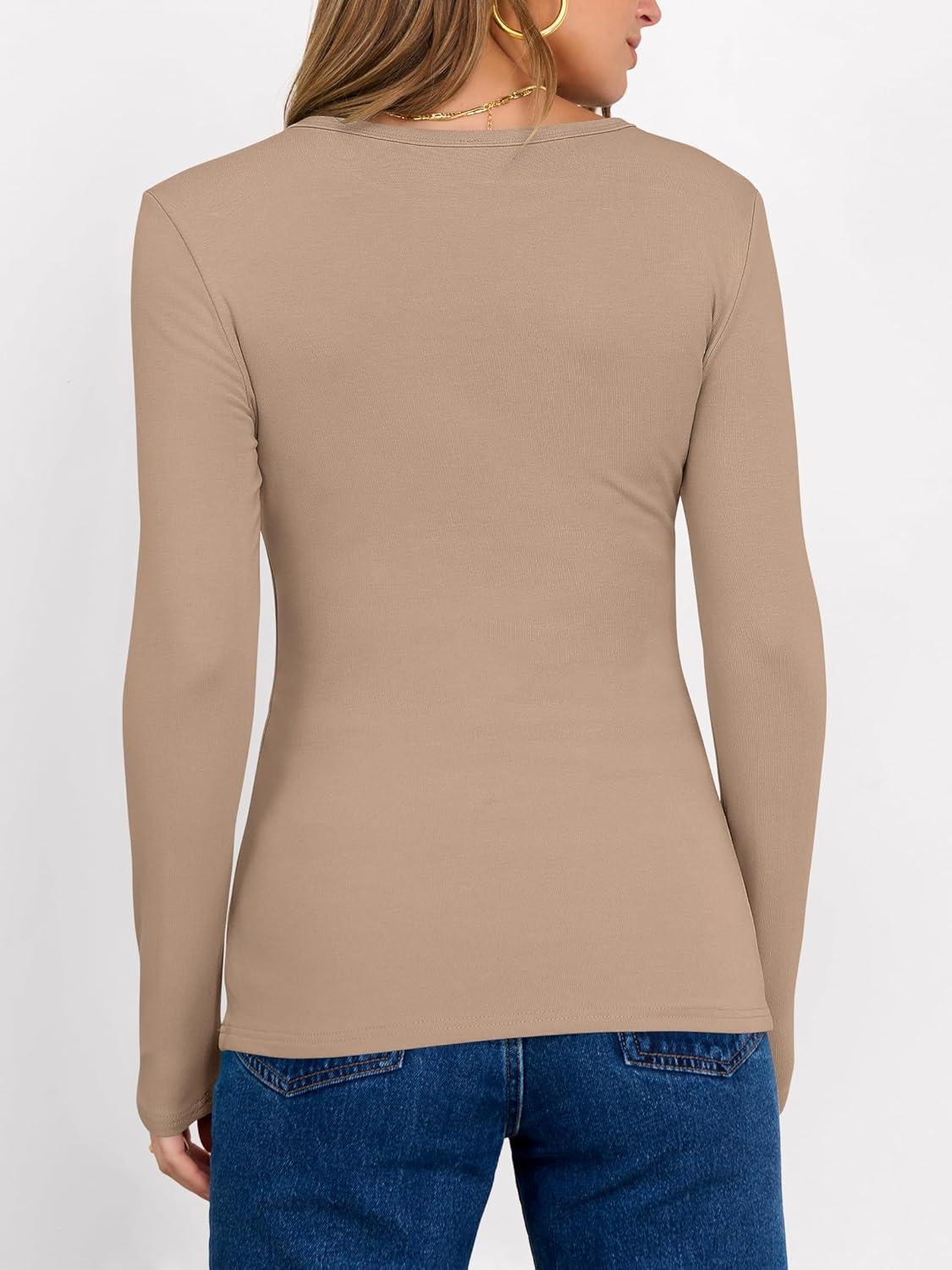 ANRABESS Women Long Sleeve Thermal Shirt Fleece Tops 2026 Fall Winter Crew Neck Casual Base Layer T-Shirts Warm Undershirts(Tan)