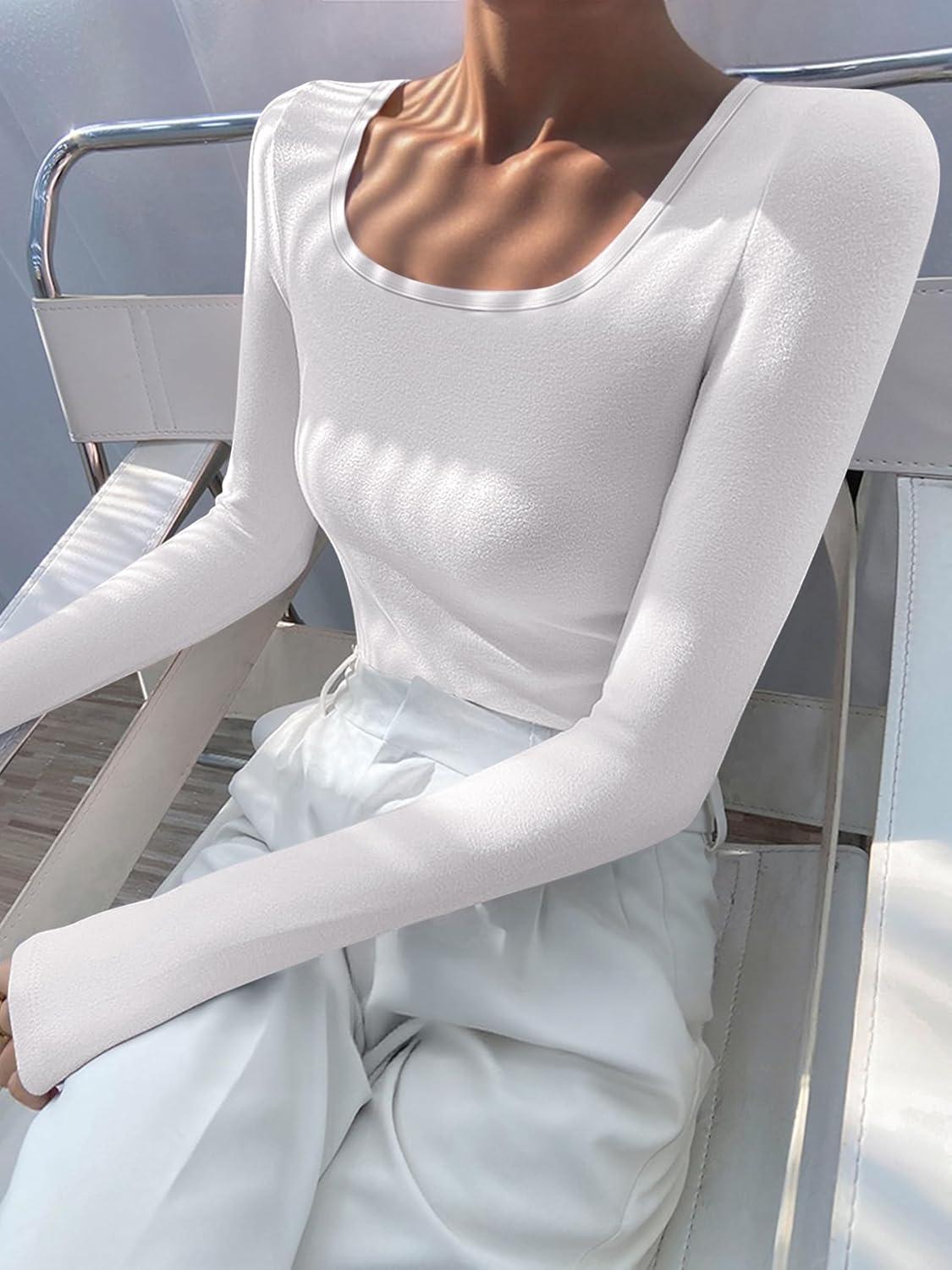 ANRABESS Women Long Sleeve Thermal Top Scoop Neck Slim Fit Fleece Shirts Basic Tee Casual 2025 Fall Winter Warm Undershirts(White)