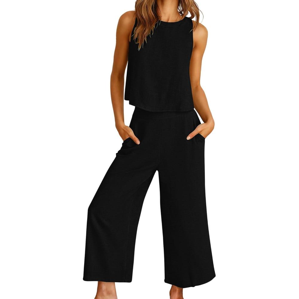 ANRABESS Women Lounge Sets 2 Piece Outfits Summer Sleeveless Crop Tops Capri Wide Leg Pants Vacation Beach Travel Sets(Black)