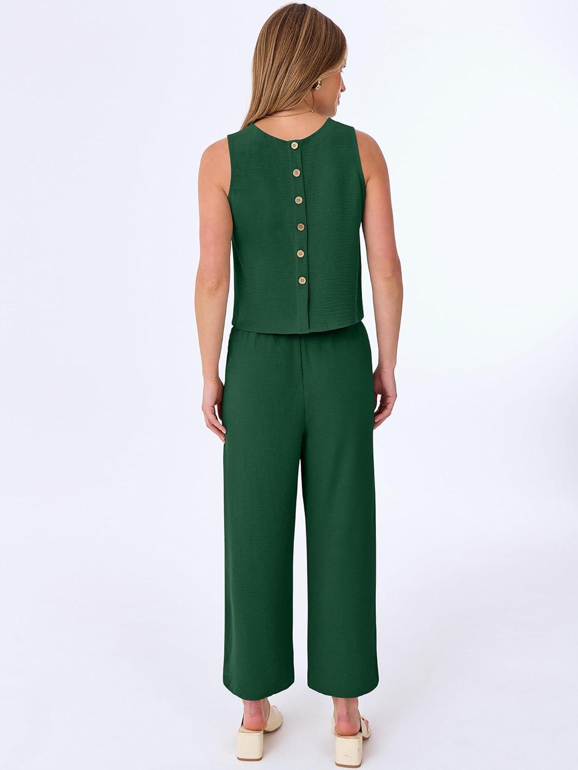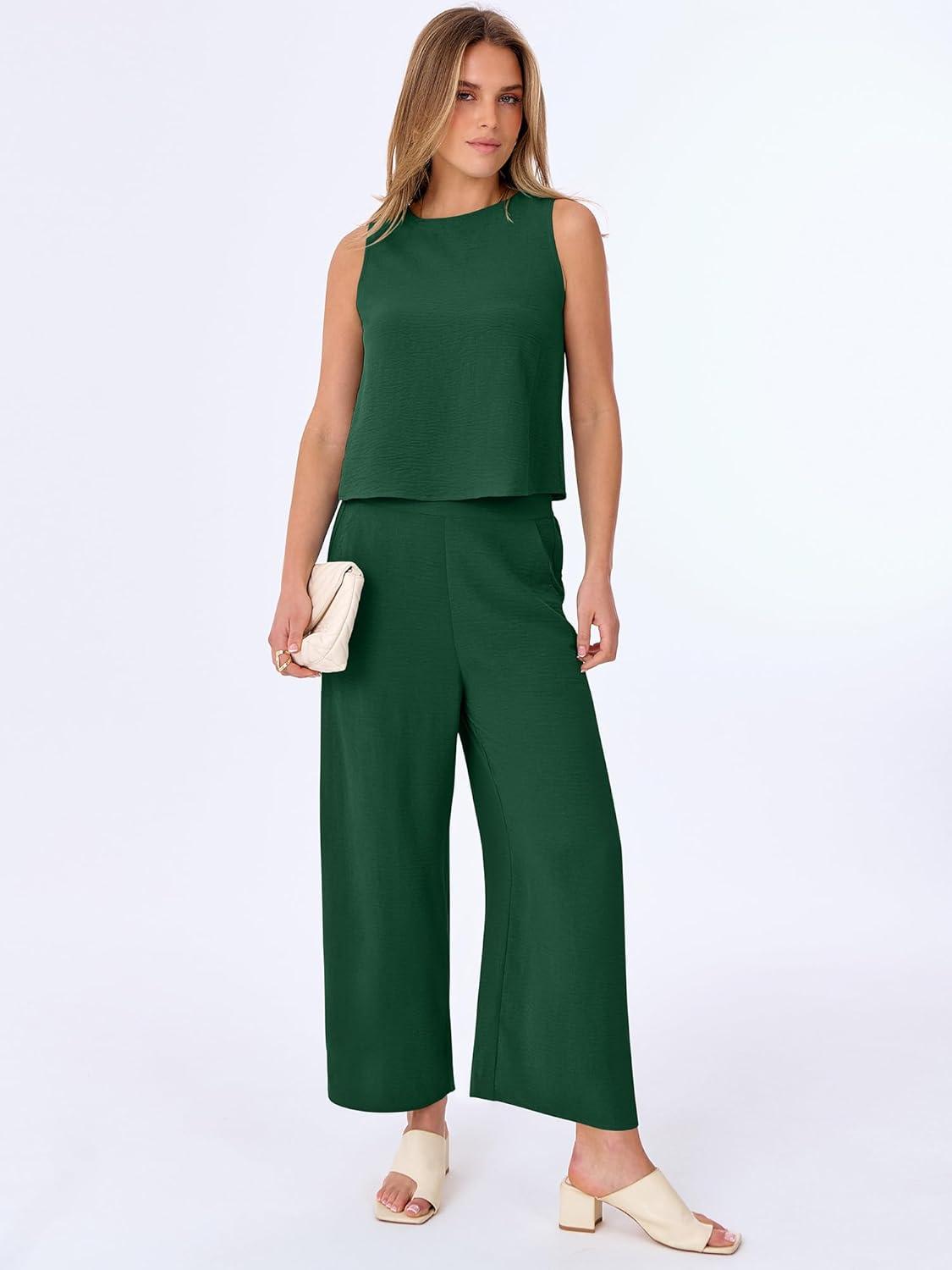 ANRABESS Women Lounge Sets 2 Piece Outfits Summer Sleeveless Crop Tops Capri Wide Leg Pants Vacation Beach Travel Sets(Dark Green)