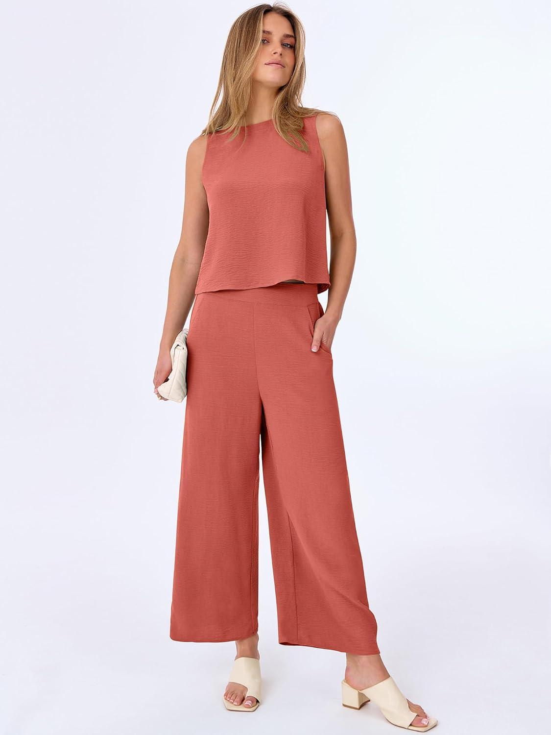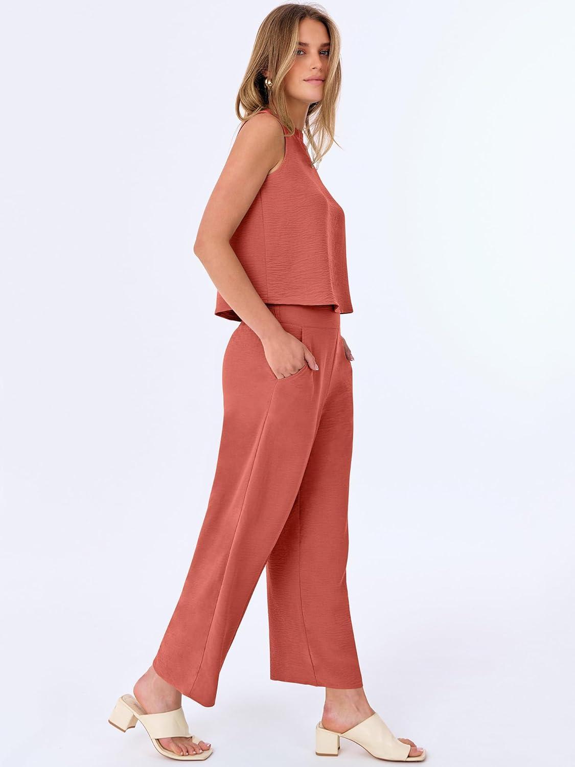 ANRABESS Women Lounge Sets 2 Piece Outfits Summer Sleeveless Crop Tops Capri Wide Leg Pants Vacation Beach Travel Sets(Orange Red)