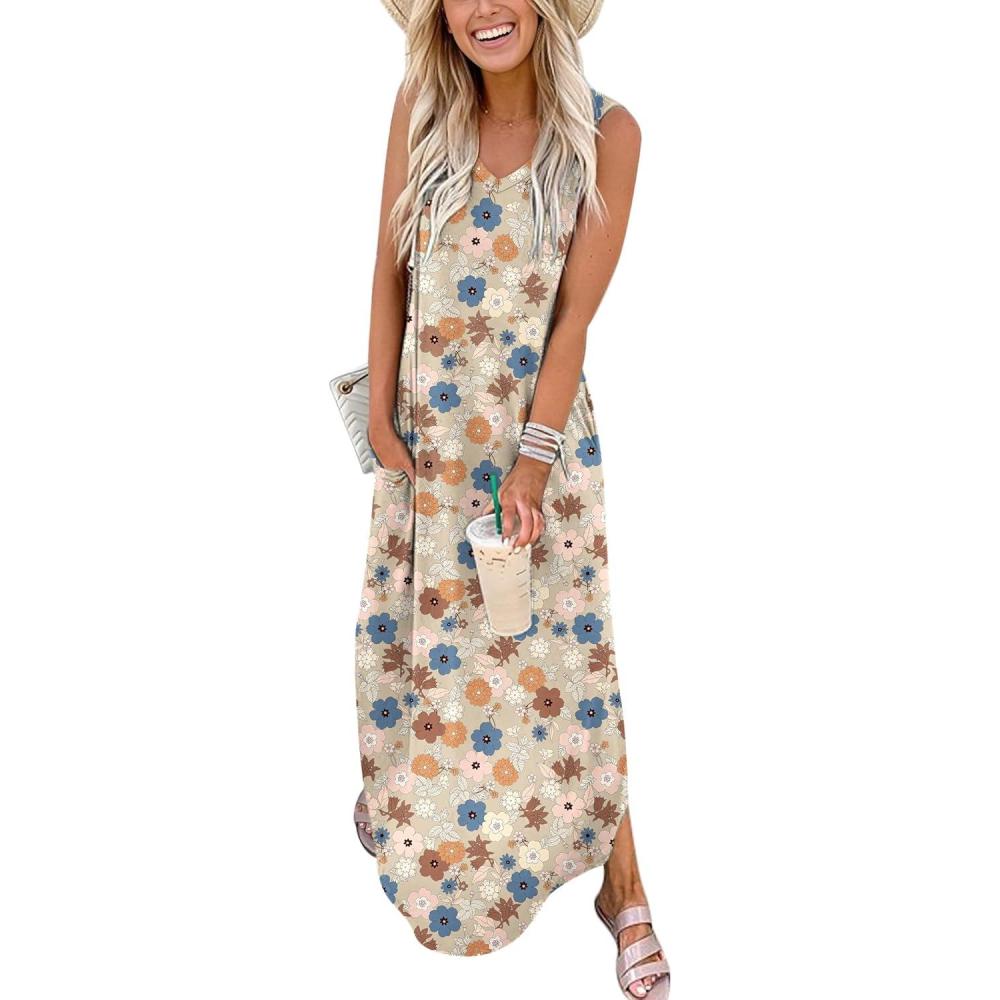 ANRABESS Women Maxi Dress Summer Casual Sleeveless V Neck Sundress Coverups Beach Vacation Clothes with Pockets.This maxi dress for women is designed with loose fit,v neck,long length,solid color,floral printed,sleeveless,side split and two side pockets.