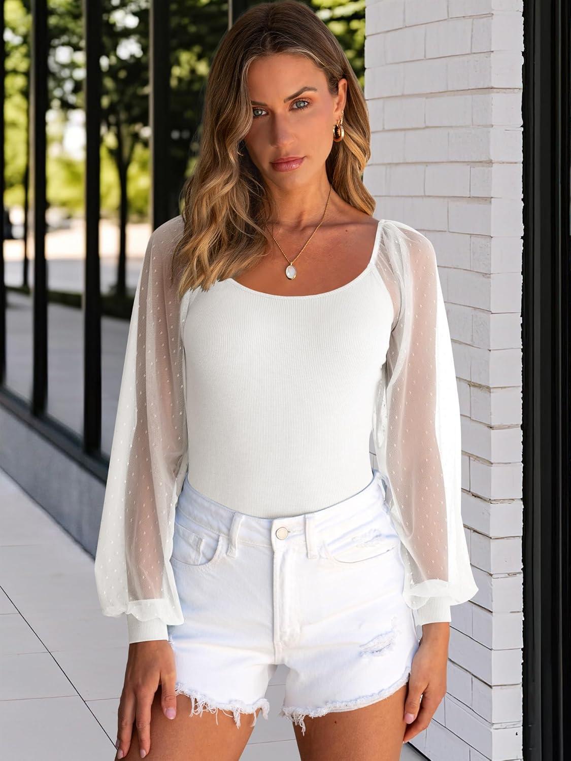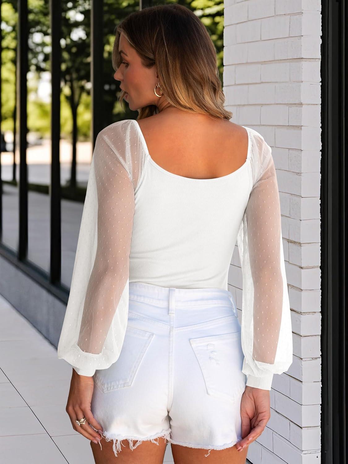 ANRABESS Women Mesh Long Sleeve Shirts Dressy Casual Blouses Square Neck Ribbed Slim Tops Going Out Date Night Fall Outfits(White)