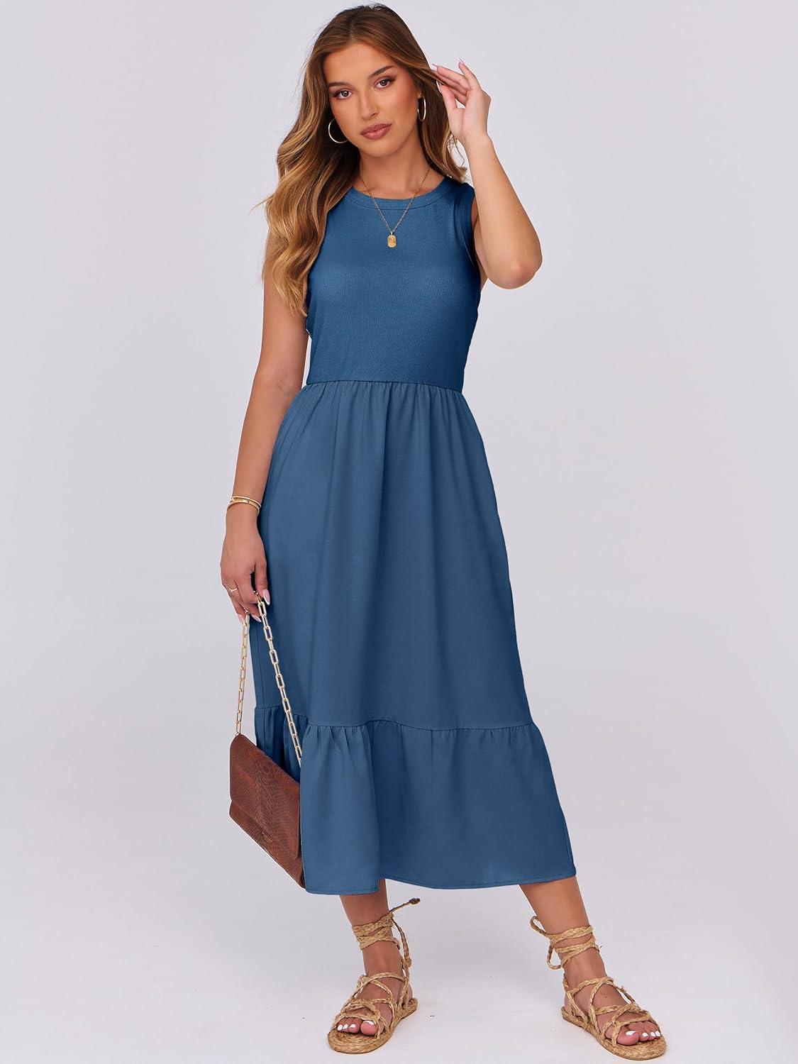ANRABESS Women Midi Dresses 2025 Summer Casual Sleeveless Sundress High Neck Tank Top Racerback Flowy Beach Dress & Pockets(Blue)