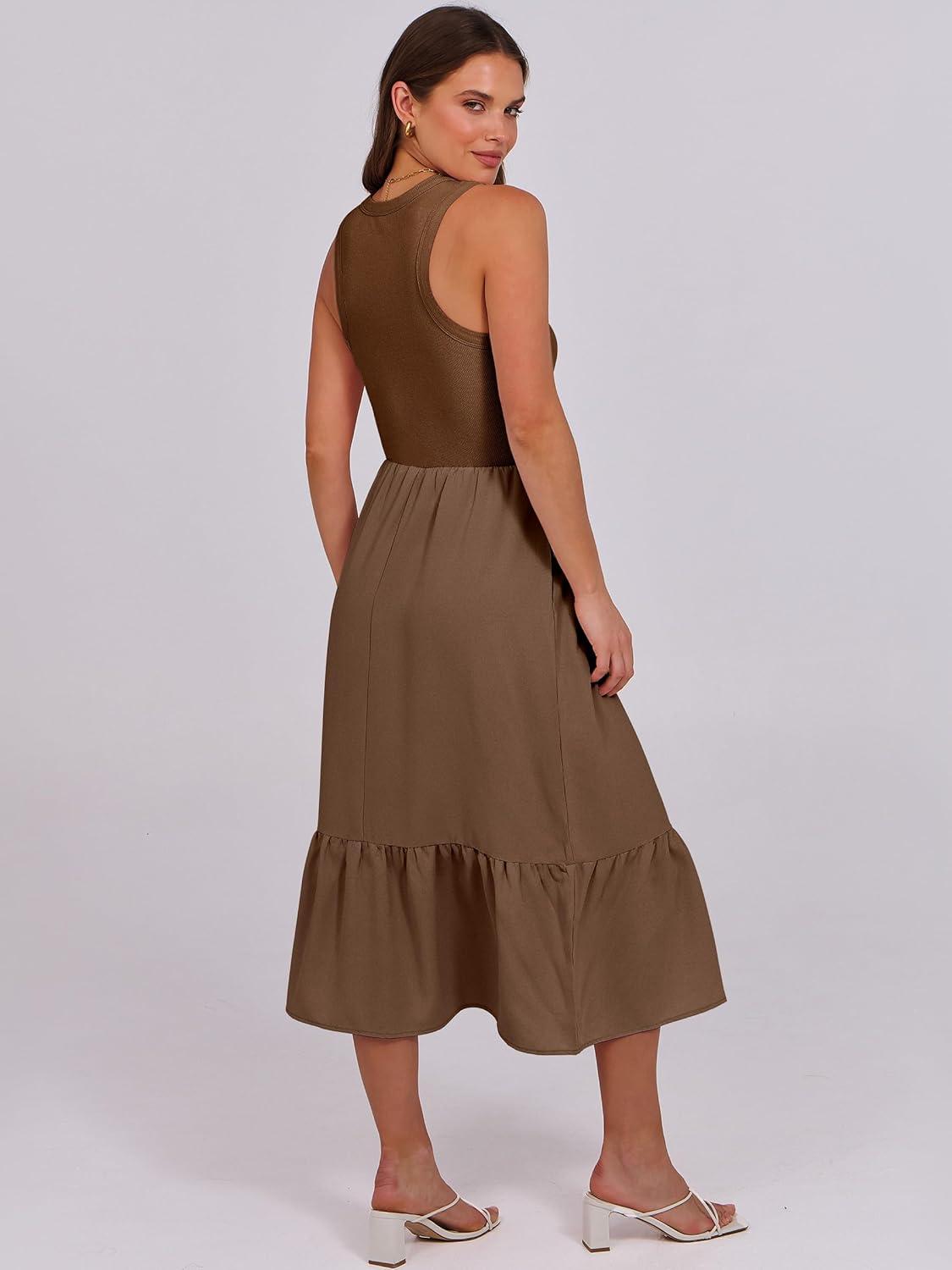 ANRABESS Women Midi Dresses 2025 Summer Casual Sleeveless Sundress High Neck Tank Top Racerback Flowy Beach Dress & Pockets(Brown)