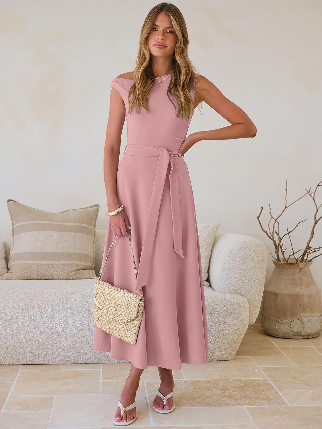 ANRABESS Women One Off Shoulder Wedding Guest Formal Dress Sleeveless Flowy Spring Summer Cocktail Evening Maxi Dresses 2026(Light Pink)