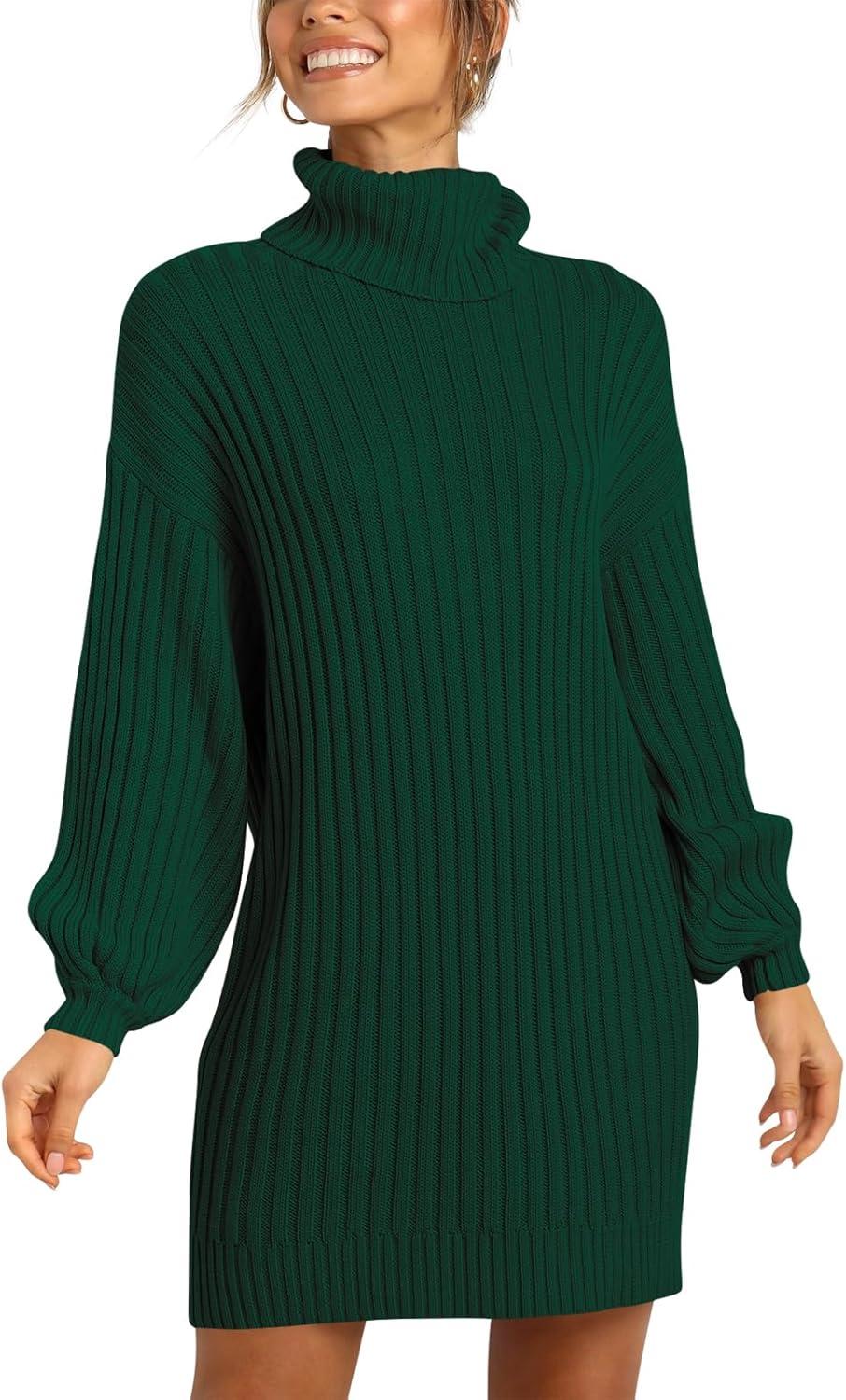 ANRABESS Women Oversized Sweater Dress Turtleneck Batwing Long Sleeve Ribbed Knit Loose 2025 Fall Winter Casual Short Dress(Dark Green)