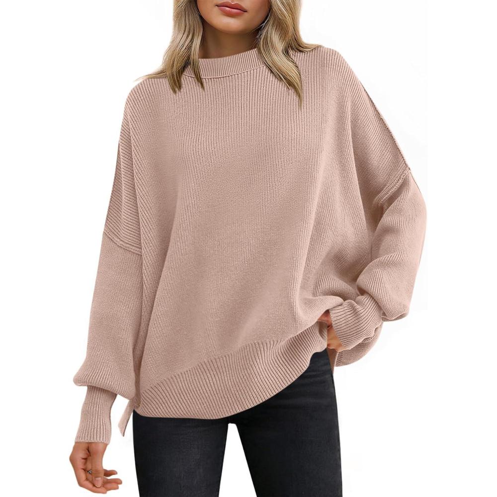 ANRABESS Women Oversized Sweaters Batwing Long Sleeve 2025 Fall Outfits Crewneck Casual Knit Side Slit Fashion Pullover Top(Flush Pink)