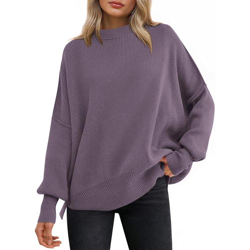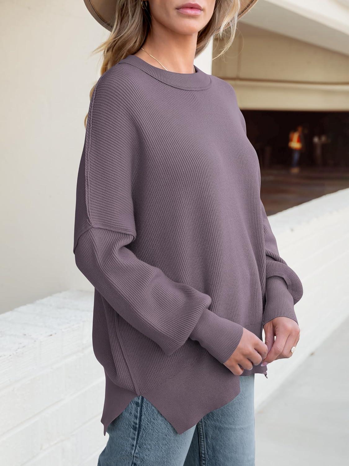 ANRABESS Women Oversized Sweaters Batwing Long Sleeve 2025 Fall Outfits Crewneck Casual Knit Side Slit Fashion Pullover Top(Purple)