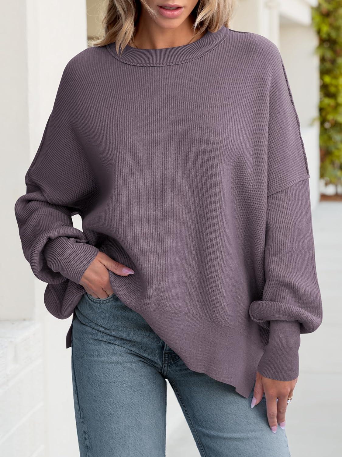 imageANRABESS Women Oversized Sweaters Batwing Long Sleeve 2025 Fall Outfits Crewneck Casual Knit Side Slit Fashion Pullover TopPurple