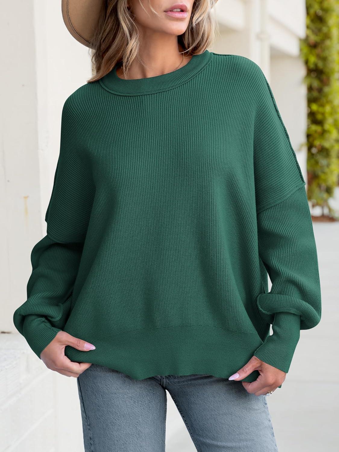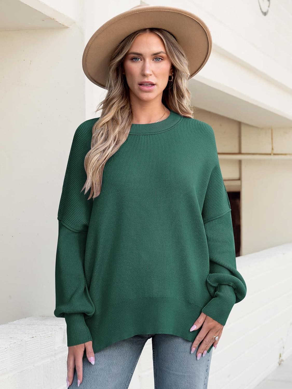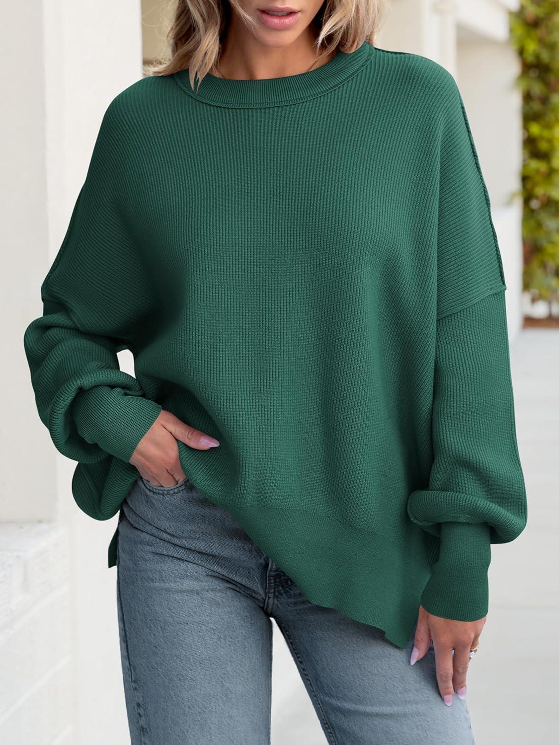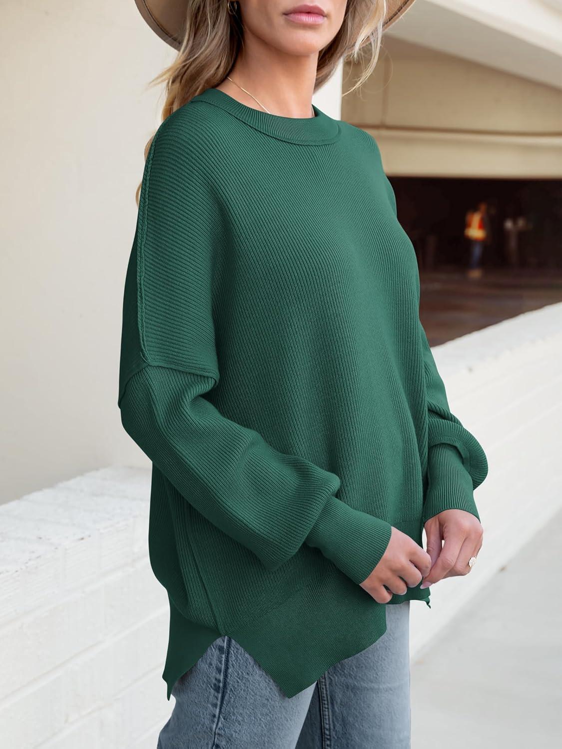 ANRABESS Women Oversized Sweaters Batwing Long Sleeve 2026 Fall Outfits Crewneck Casual Knit Side Slit Fashion Pullover Top(Opal Green)