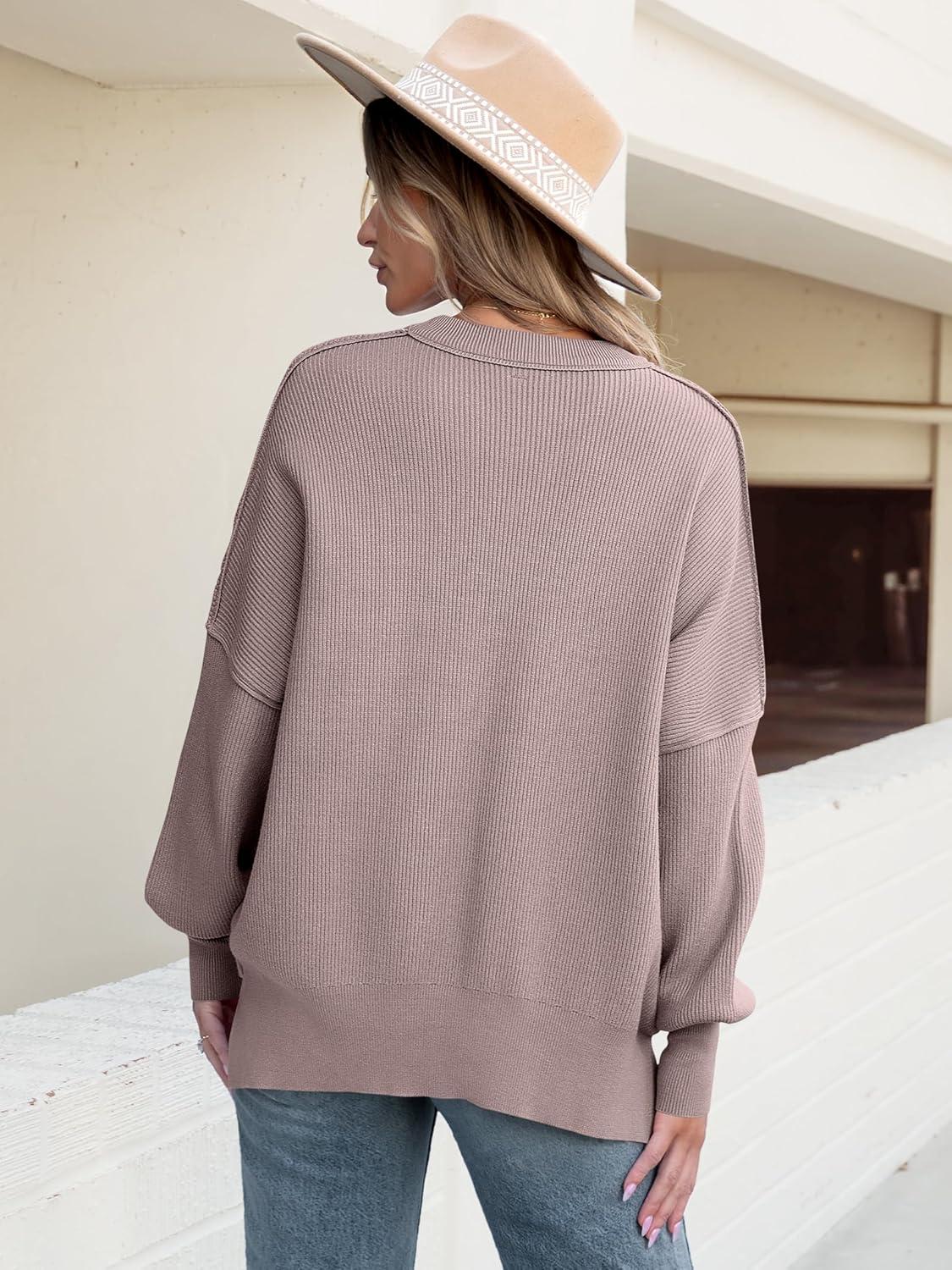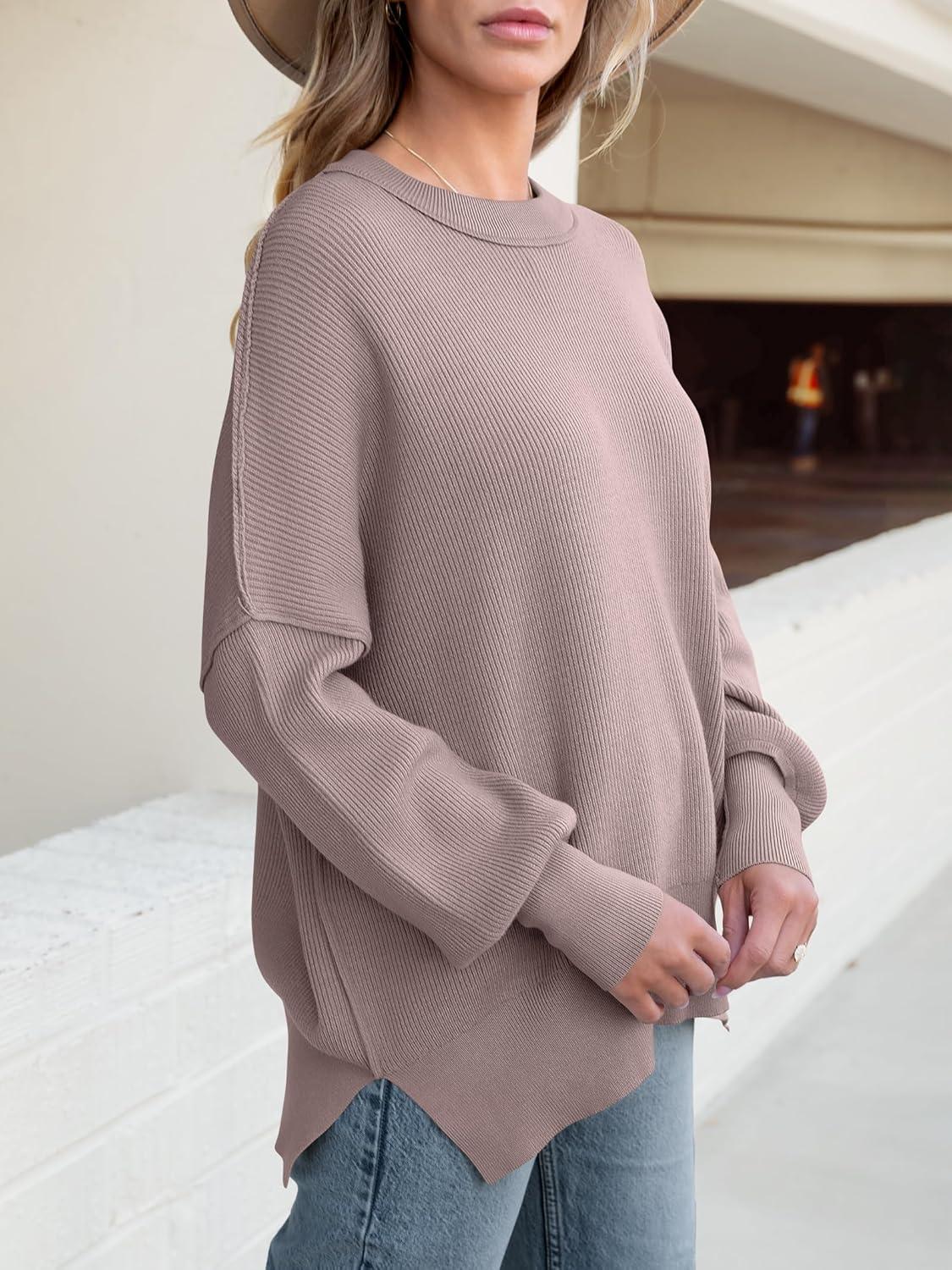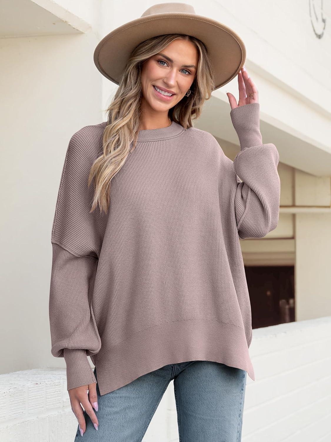 imageANRABESS Women Oversized Sweaters Batwing Long Sleeve 2026 Fall Outfits Crewneck Casual Knit Side Slit Fashion Pullover TopPink