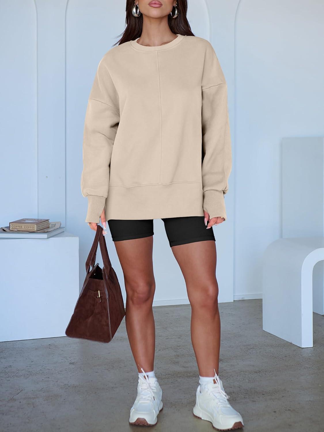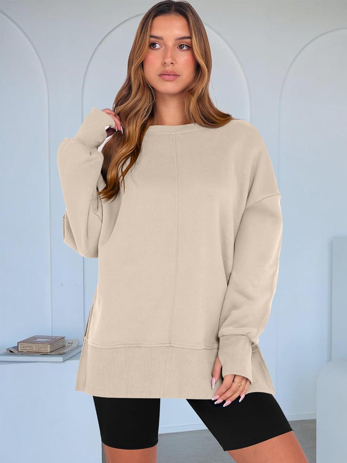 ANRABESS Women Oversized Sweatshirts Thumbhole Long Sleeve Hoodies Shirts 2025 Fall Side Slit Pullover Top Teen Y2k Outfits(Parchment)