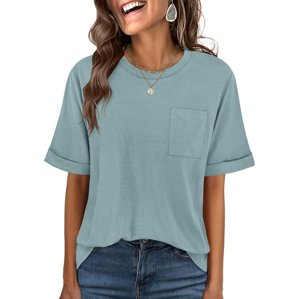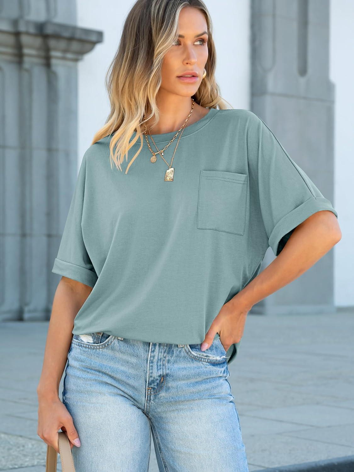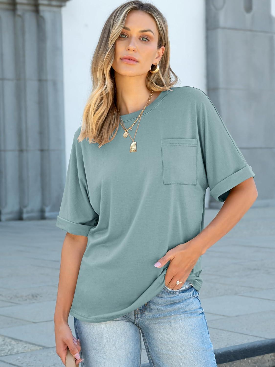 ANRABESS Women Oversized T Shirts Short Sleeve Summer Casual Loose Top Basic Tee with Pocket(Cadet Blue)