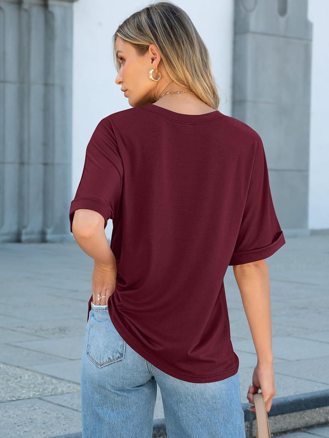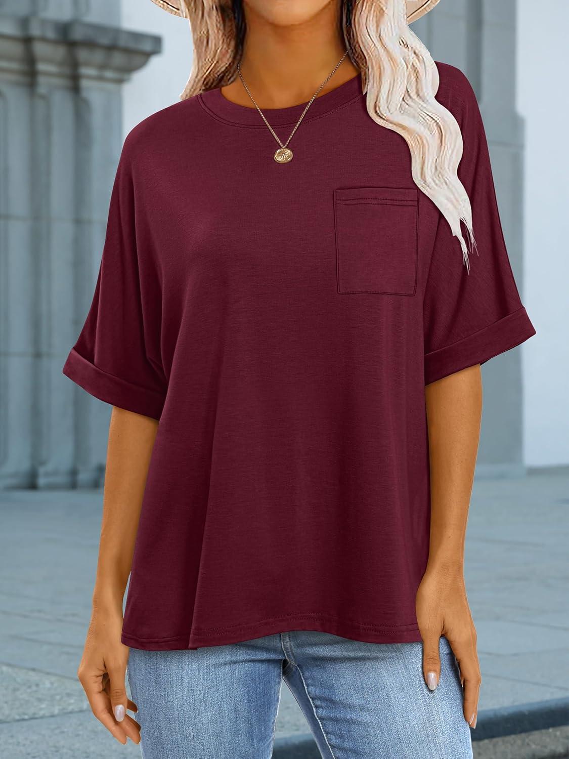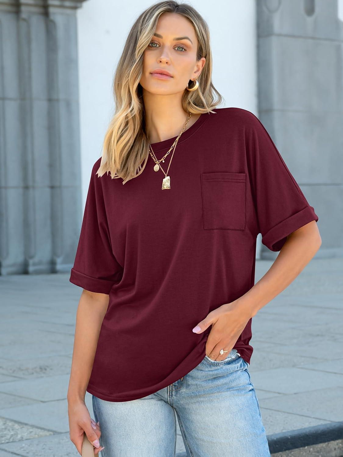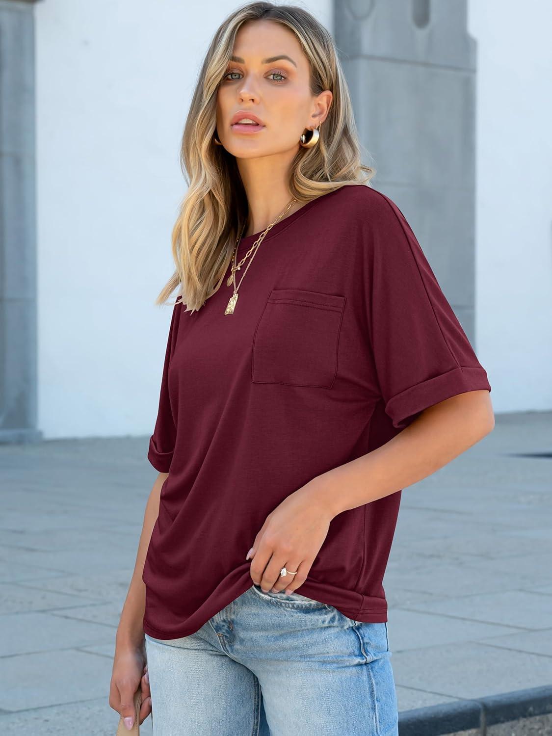 ANRABESS Women Oversized T Shirts Short Sleeve Summer Casual Loose Top Basic Tee with Pocket(Deep Red)