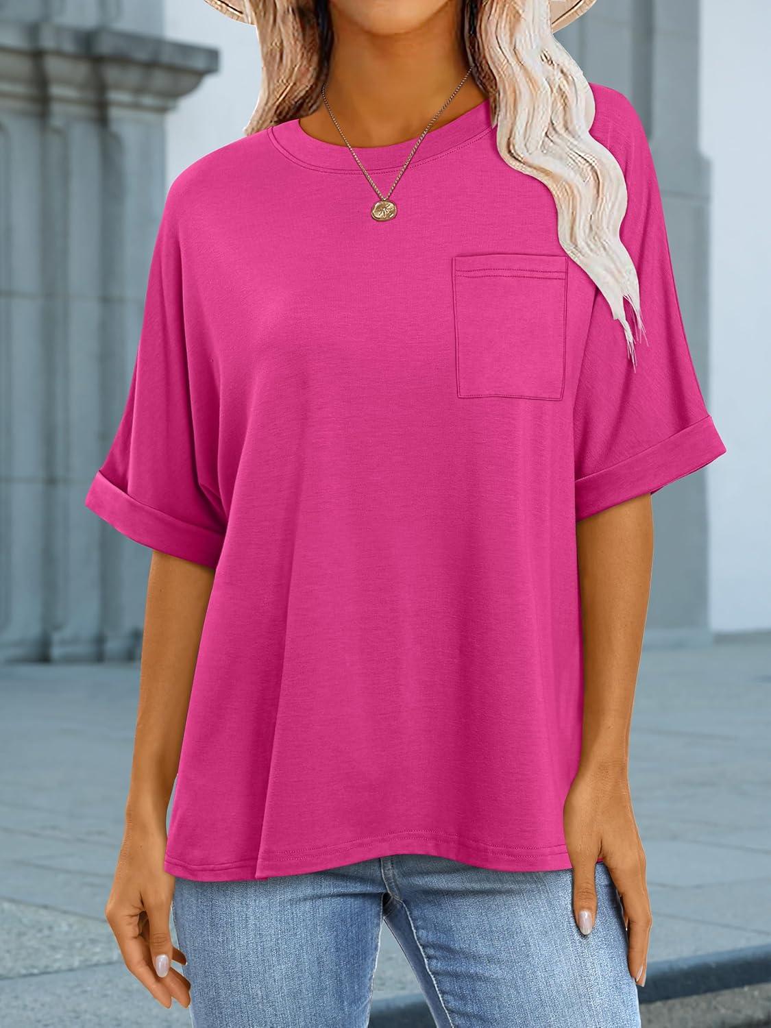 ANRABESS Women Oversized T Shirts Short Sleeve Summer Casual Loose Top Basic Tee with Pocket(Hot Pink)