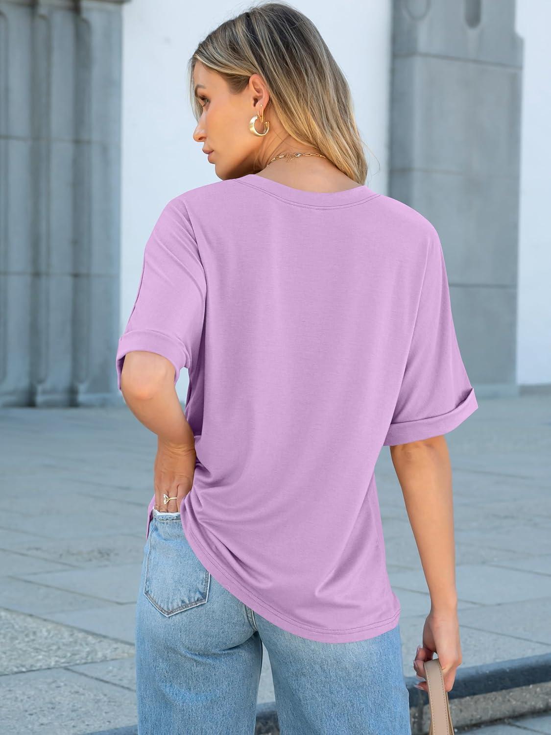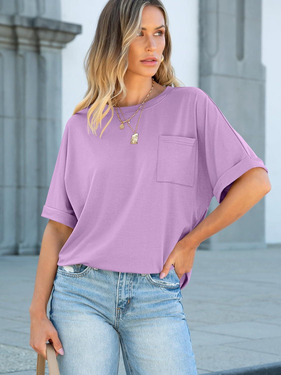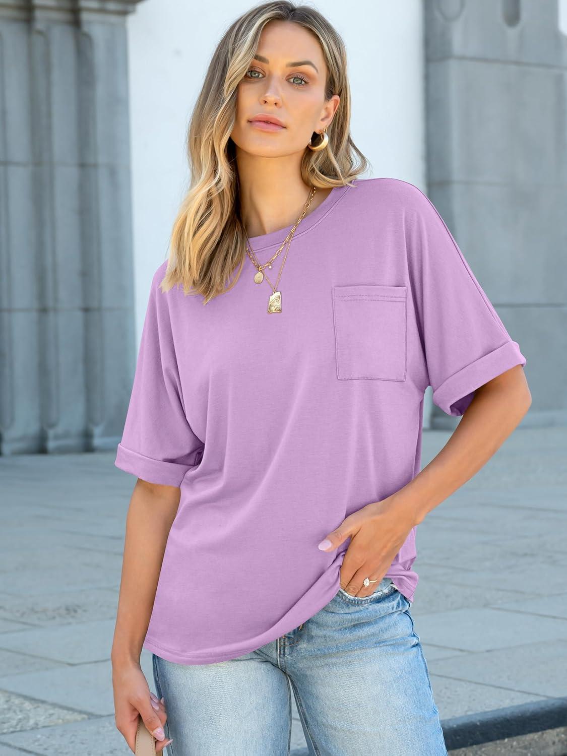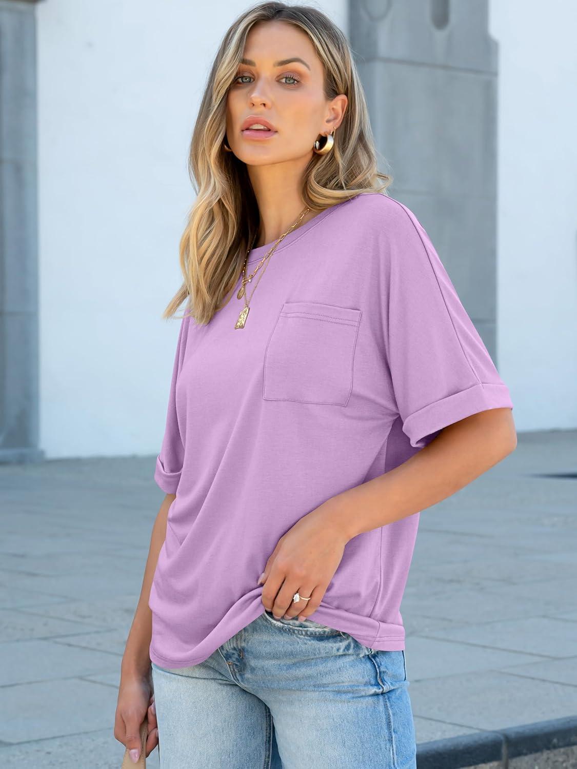 ANRABESS Women Oversized T Shirts Short Sleeve Summer Casual Loose Top Basic Tee with Pocket(Light Purple)